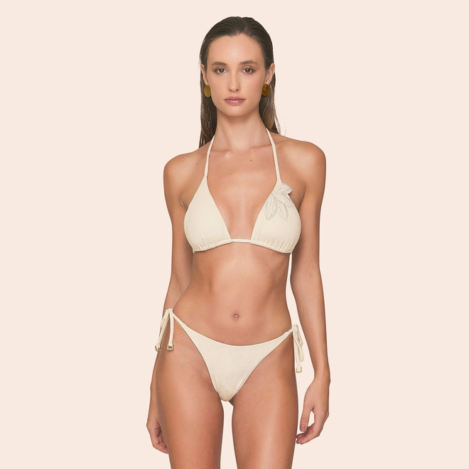 Com uma sensação de frescor e calmaria, o conjunto de top cortininha especial e calcinha laço com amarração é ideal para quem busca leveza, sofisticação e personalidade nos dias de sol. As duas peças são confeccionadas em jacquard beach — tecido texturizado que valoriza o visual com delicadeza e originalidade, além de reforçar o toque artesanal da coleção.