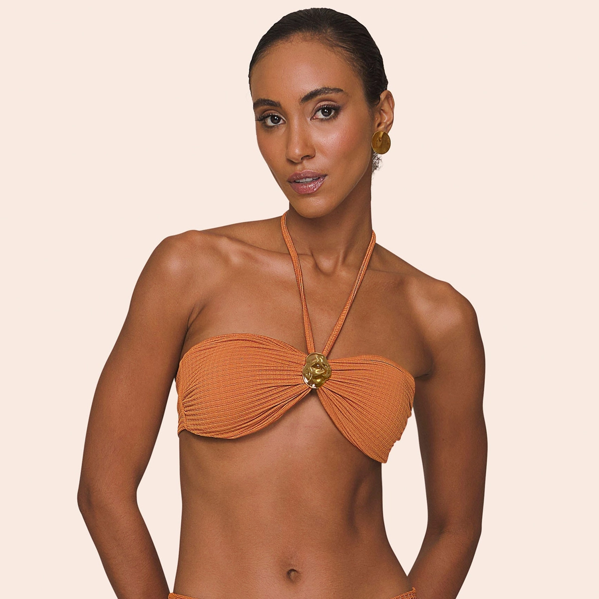 Ambas as peças são confeccionadas em lycra square, tecido jacquard de poliamida com textura refinada, e apostam em um tom terroso, tendência da temporada, que valoriza o bronzeado e adiciona sofisticação ao visual.