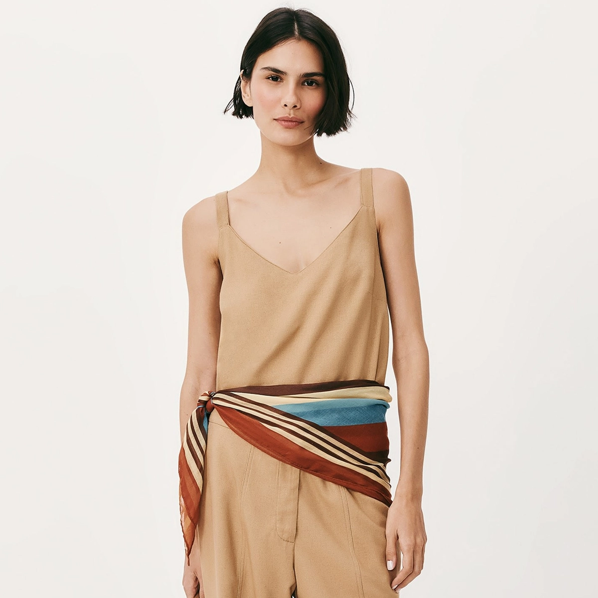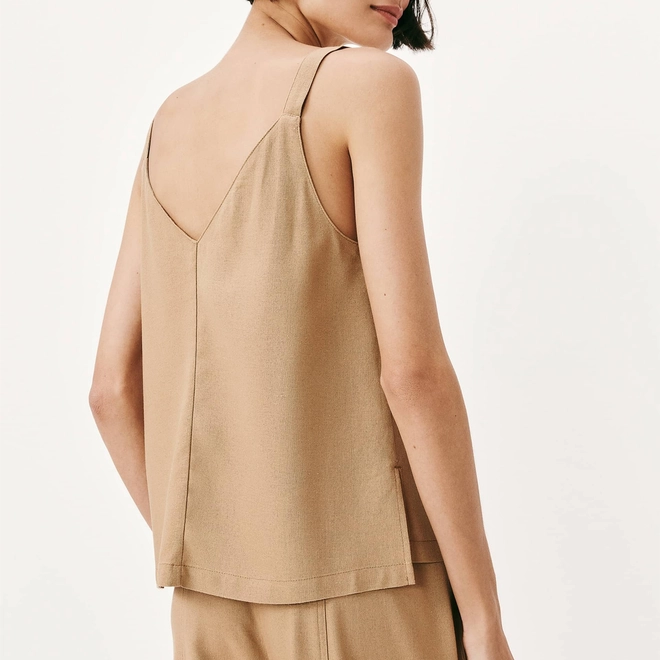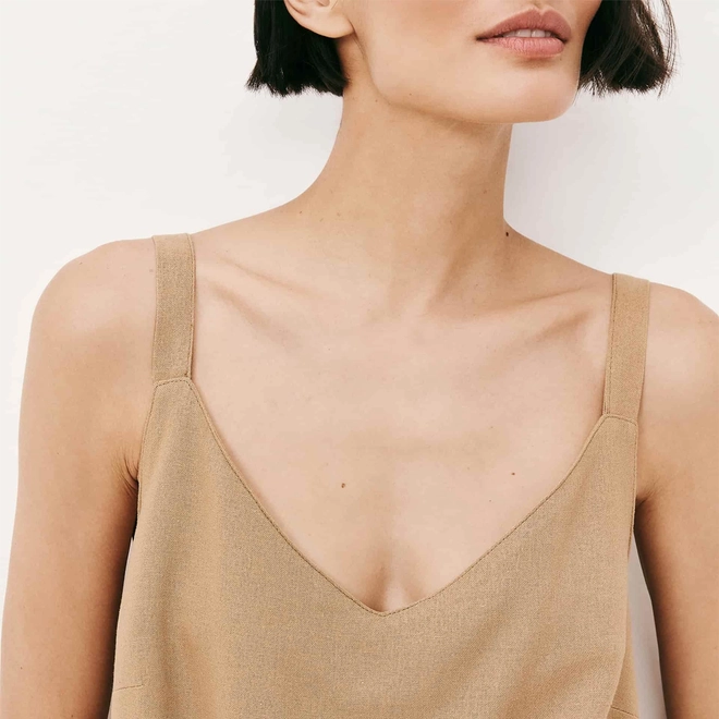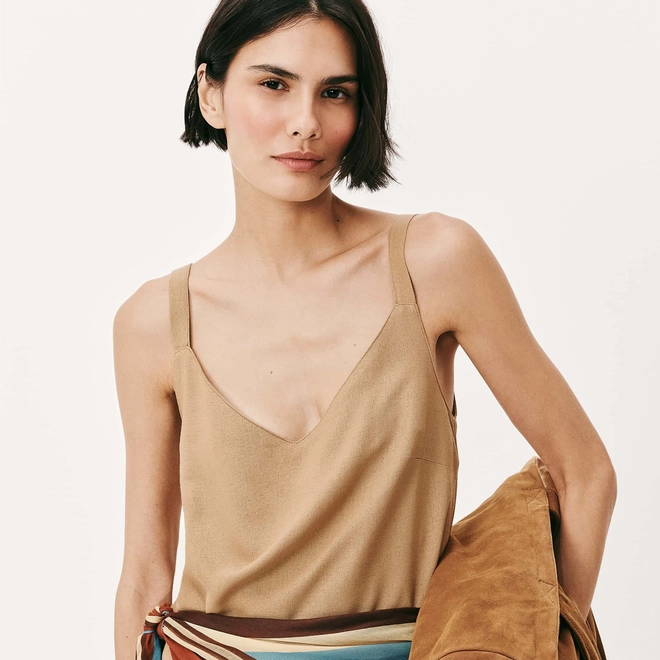 O decote em V valoriza o colo com sofisticação, enquanto o shape box oferece uma silhueta reta, moderna e descomplicada – perfeita para looks casuais ou produções mais elaboradas. As alças finas complementam o visual clean e feminino da peça.