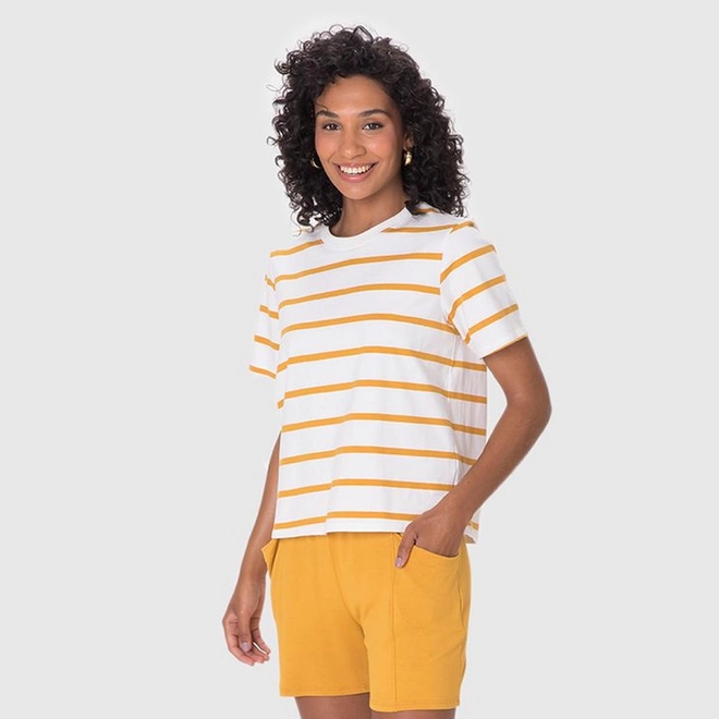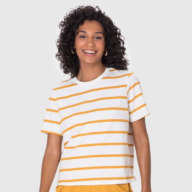 A Camiseta Feminina Reta é a união perfeita entre estilo e conforto. Com manga curta e confeccionada em malha listrada, possui toque macio e visual moderno. Sua modelagem reta proporciona ajuste confortável, sendo ideal para compor looks casuais ou despojados com praticidade.