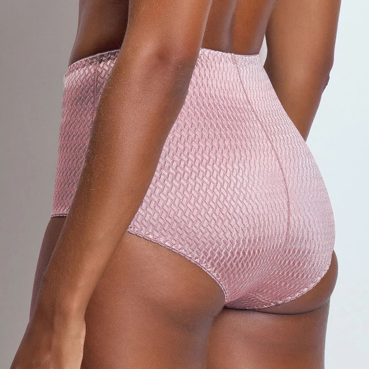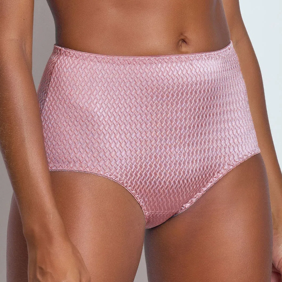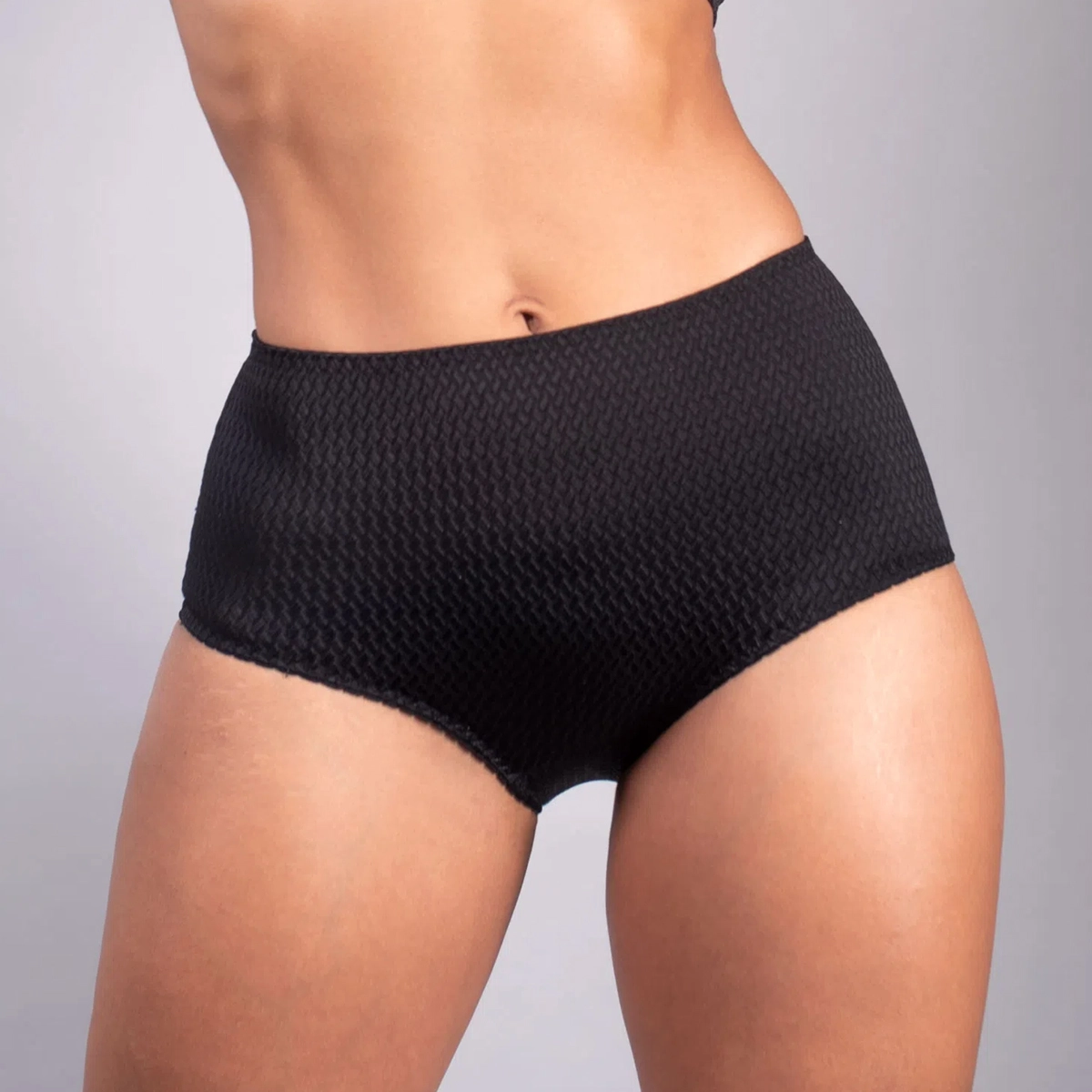 Calcinha de modelagem básica, cintura alta, laterais largas e pernas com cavas baixas.