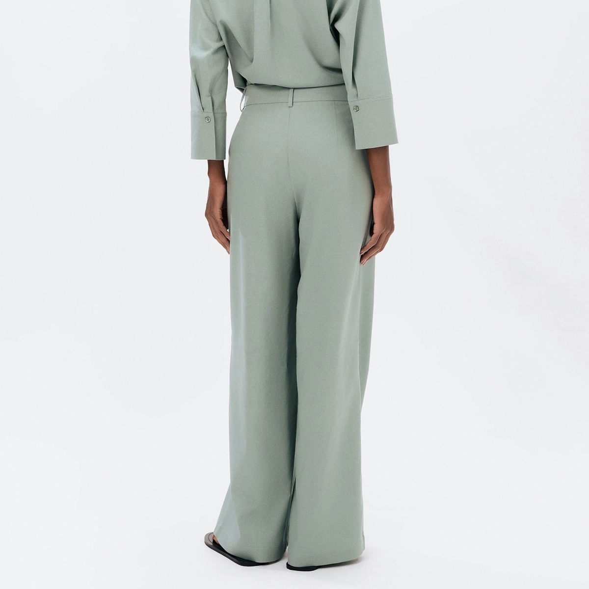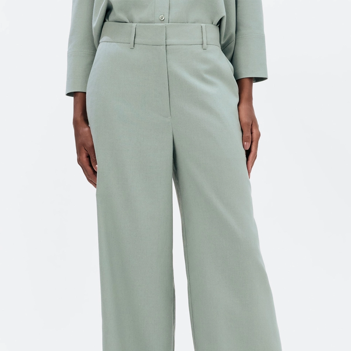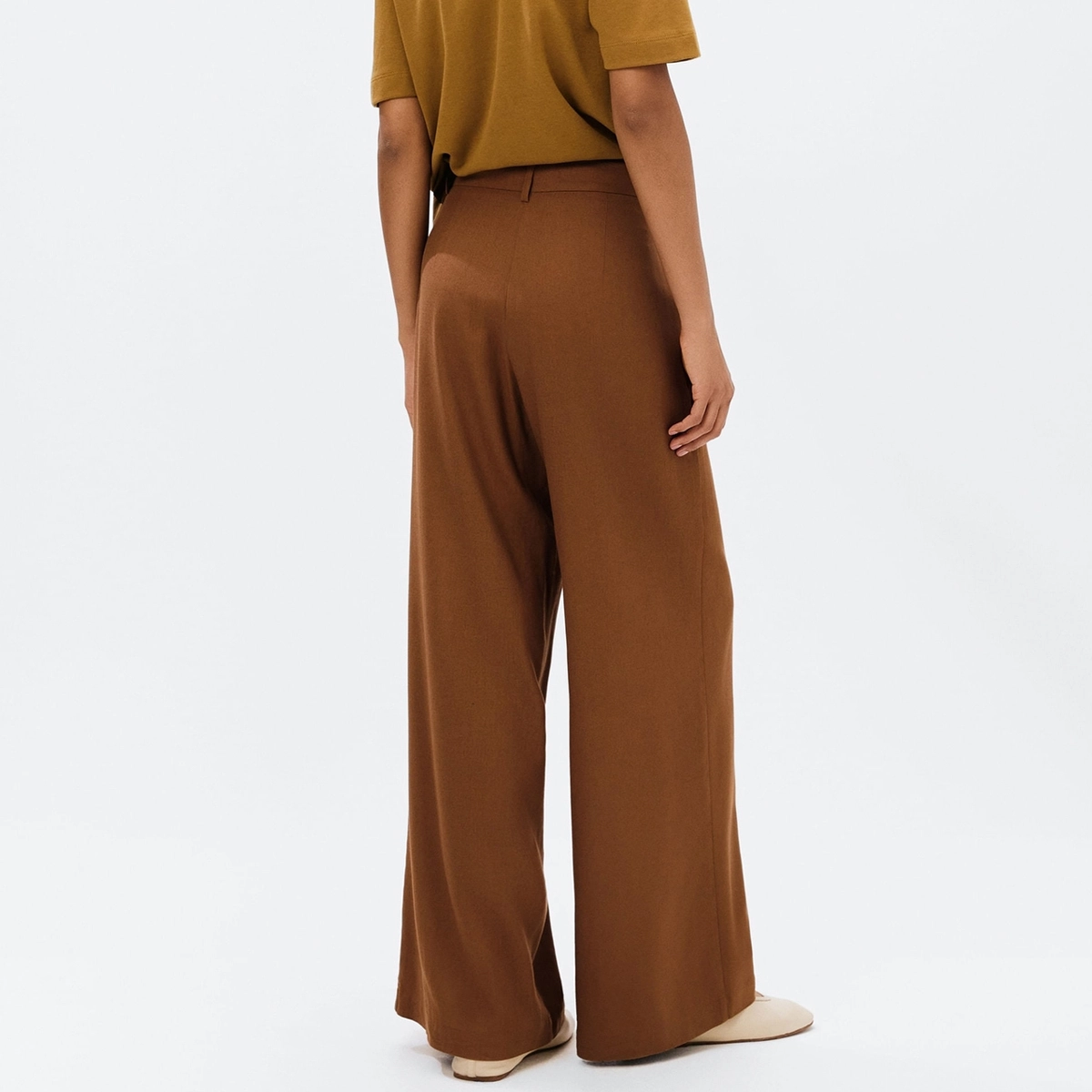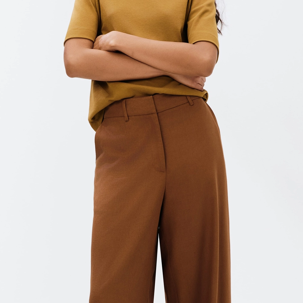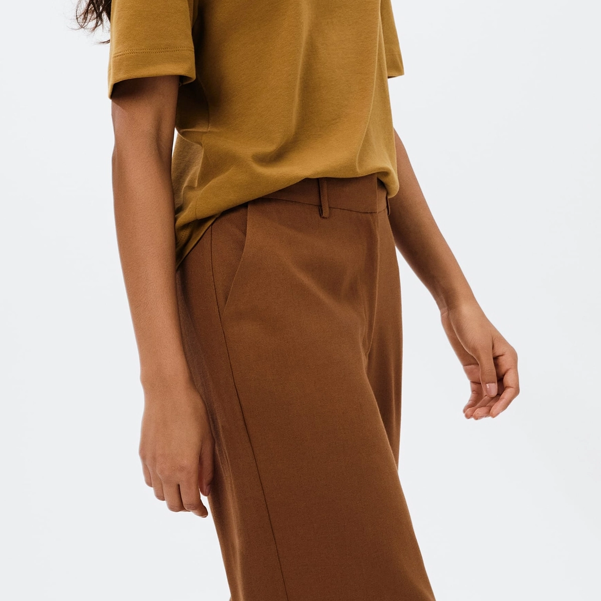 Confeccionada em tecido rústico com toque sofisticado, a peça possui 88% viscose e 12% linho, proporcionando fluidez e caimento impecável. Seu cós com passantes permite o uso de cintos para composições mais elaboradas, enquanto os bolsos faca garantem praticidade com estilo.