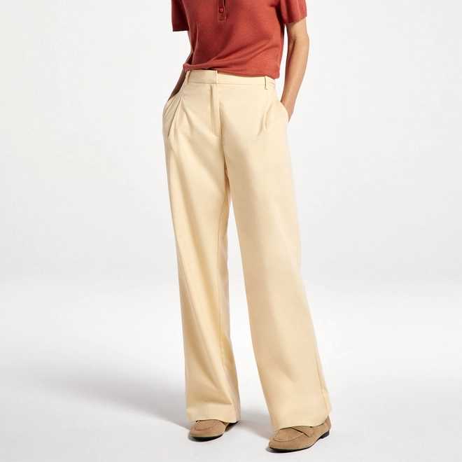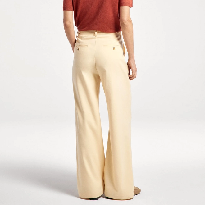 Calça reta confeccionada em tecido de alfaiataria, que proporciona caimento estruturado e visual sofisticado. Apresenta cintura média e bolsos embutidos nas costas com botões, adicionando funcionalidade e acabamento refinado. Conta ainda com martingale no cós, finalizado com botão na ponta das costas, que reforça o estilo clássico e elegante da peça.