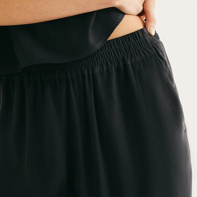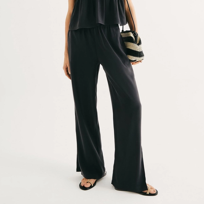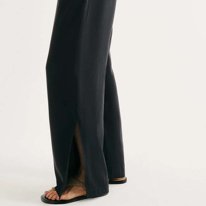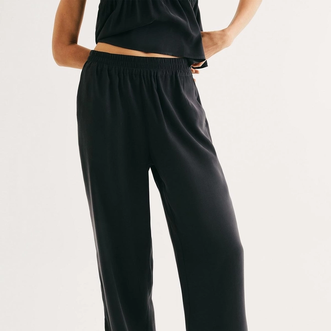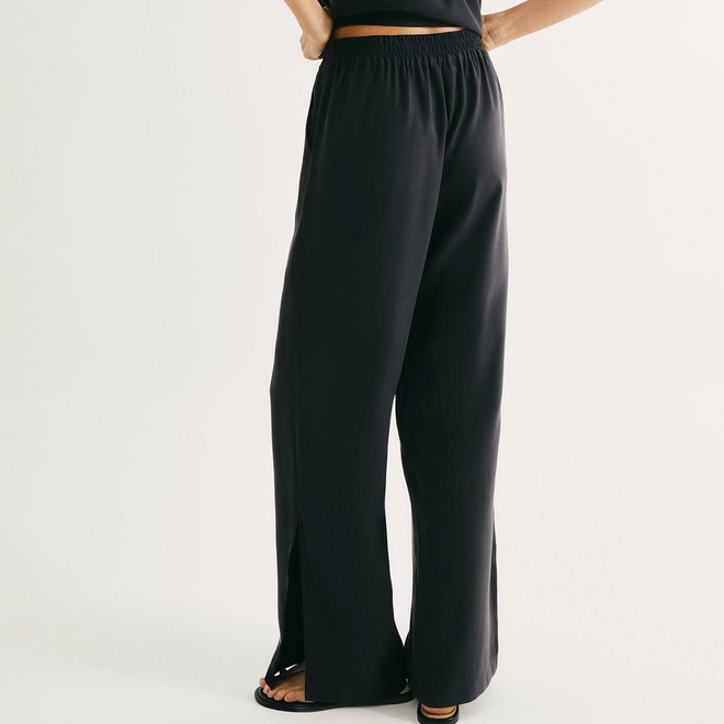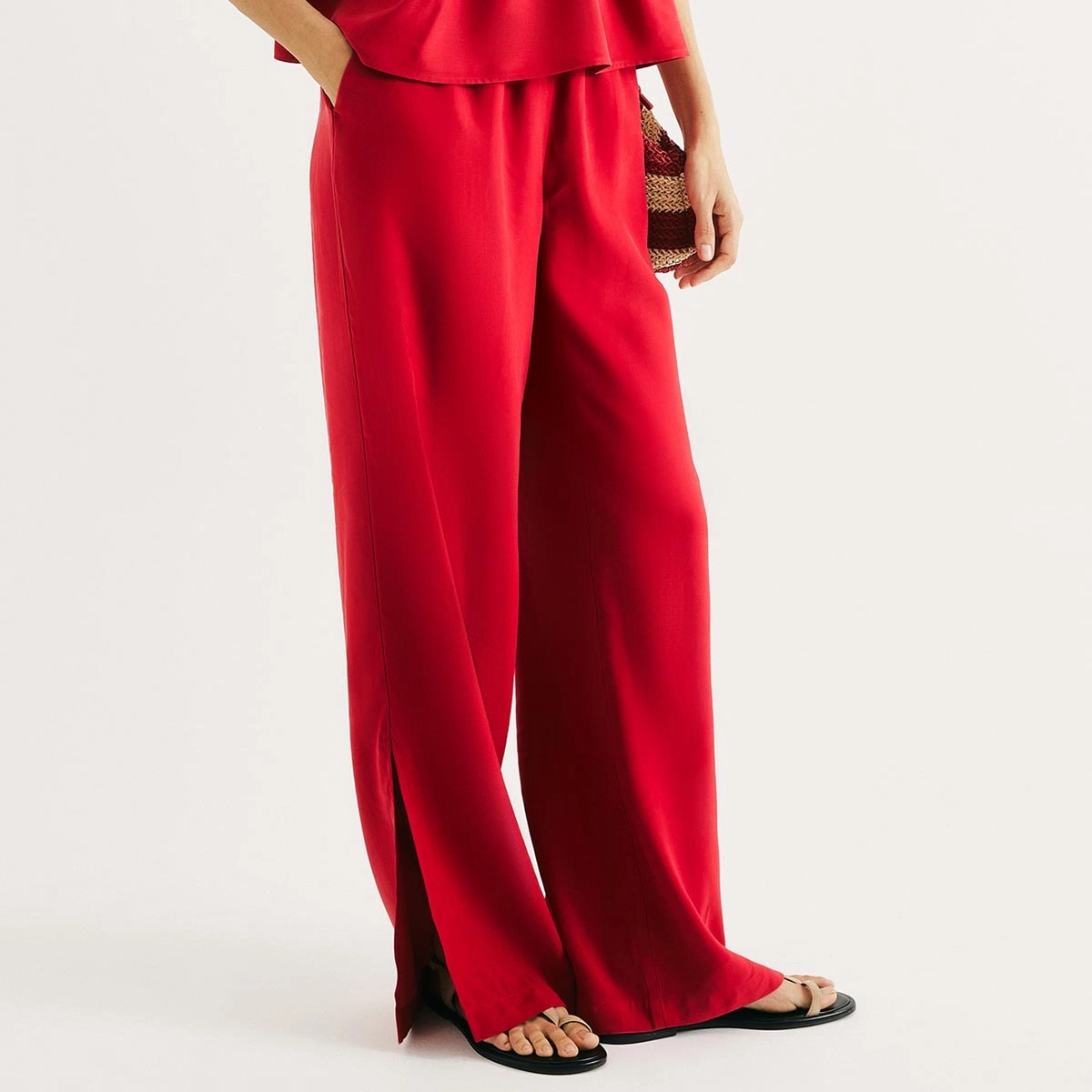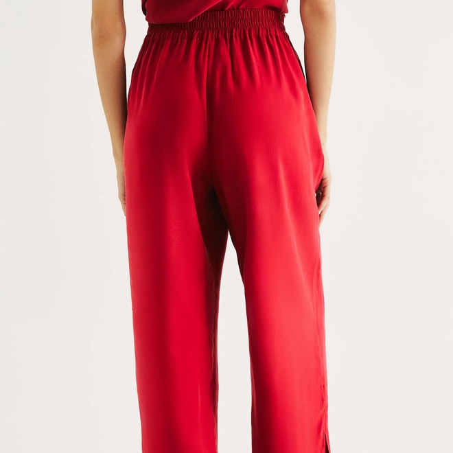 Calça em tecido peach touch, com toque macio e caimento confortável. Apresenta cintura média com cós de elástico para ajuste prático, bolsos e fendas laterais nas barras que adicionam movimento e estilo à peça. Ideal para quem busca conforto sem abrir mão do charme.
