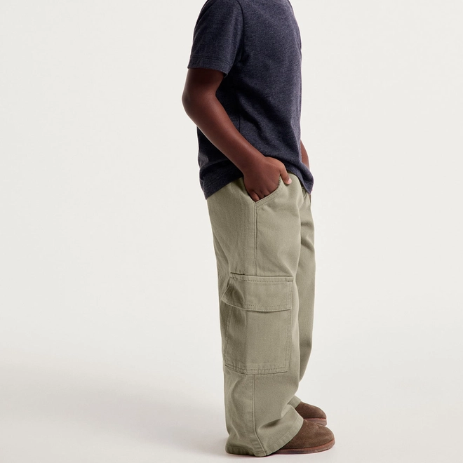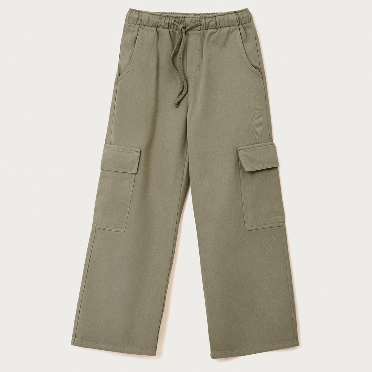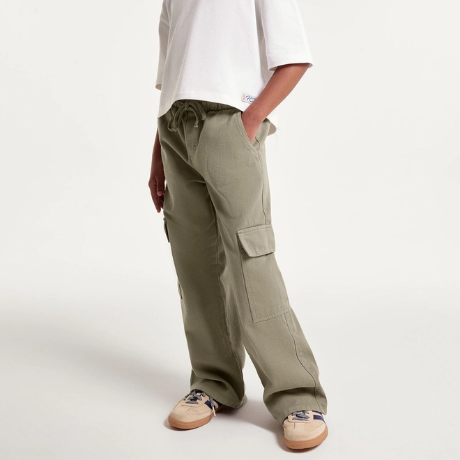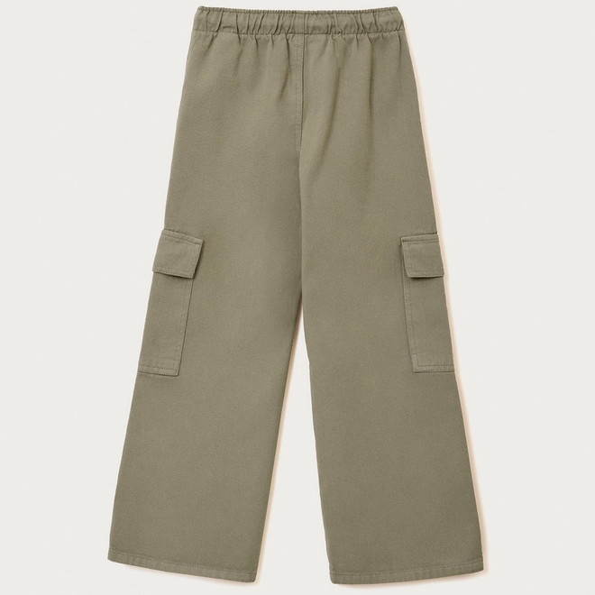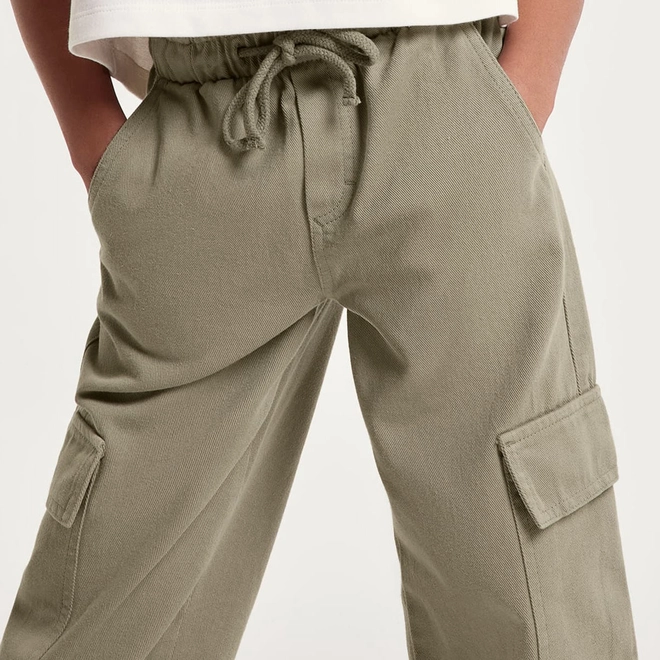 Calça em sarja com lavagem estonada. Possui modelagem wide leg, com pernas mais soltas ao corpo, bolsos embutidos, bolsos cargo laterais, cós em elástico e cordel para ajuste.