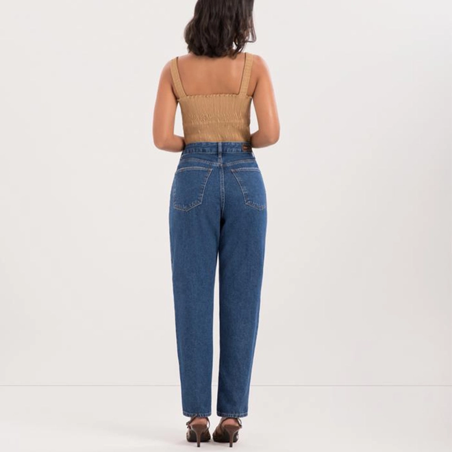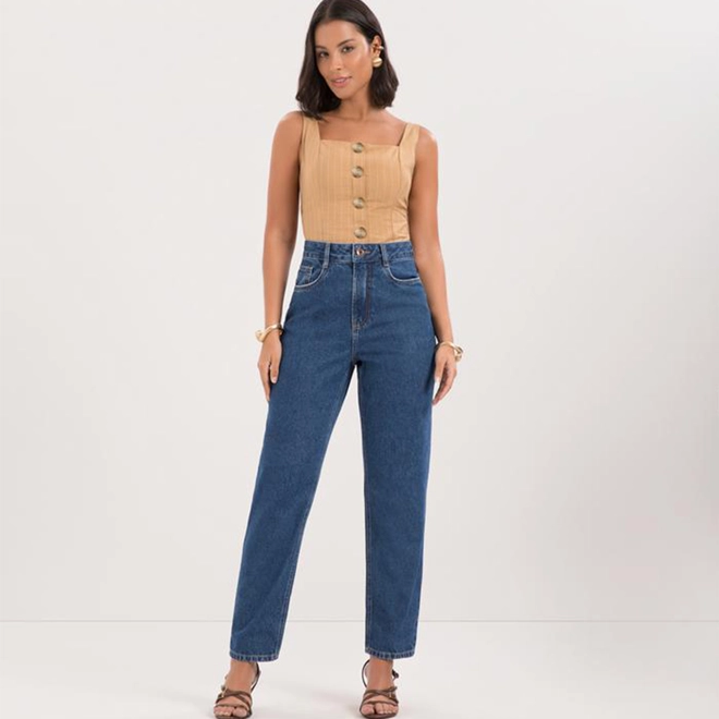 ? Modelagem Mom: Mais solta no quadril, com caimento ajustado na barra – ideal para um visual vintage e moderno ao mesmo tempo.