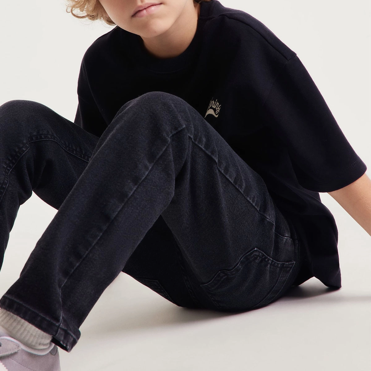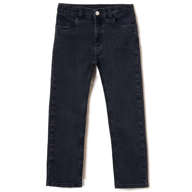 Calça infantil jeans modelagem slim. Possui shape um pouco mais justo ao corpo, cós com botão e caseados, bolsos frontais e posteriores funcionais. Destaque para o jeans black.