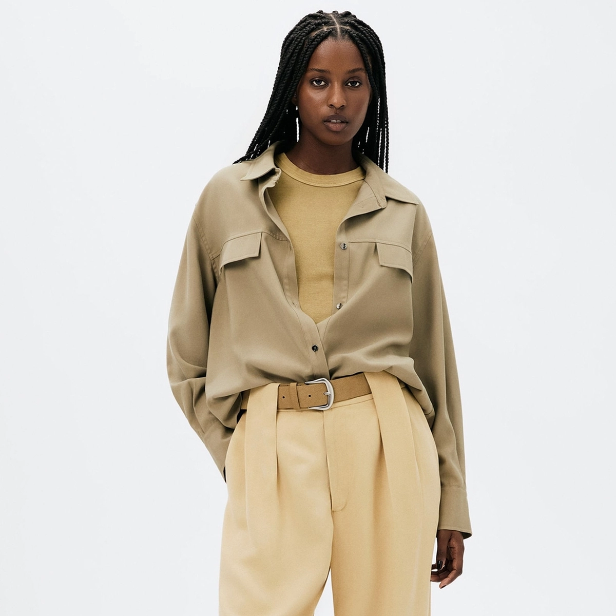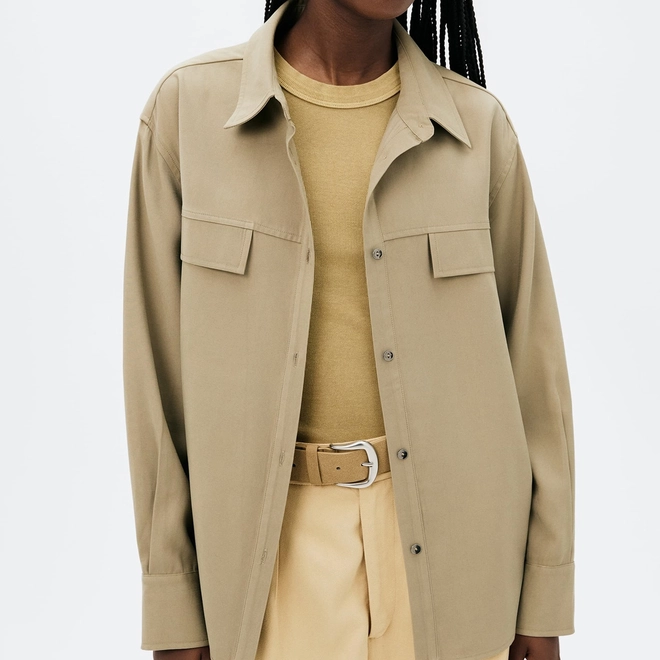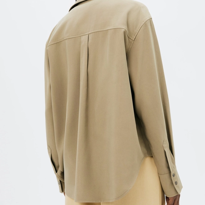 Camisa confeccionada em tecido peachtouch, apresentando toque macio. Possui modelagem regular, sendo solta do corpo, barra fraldada posterior e lapelas frontais. Fecho em botões frontais estampados.