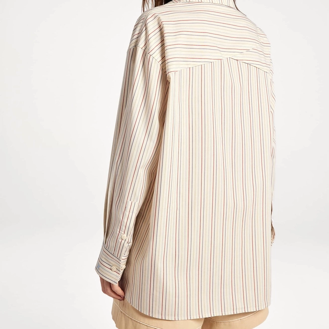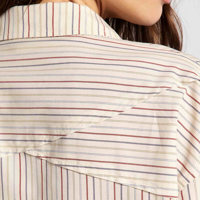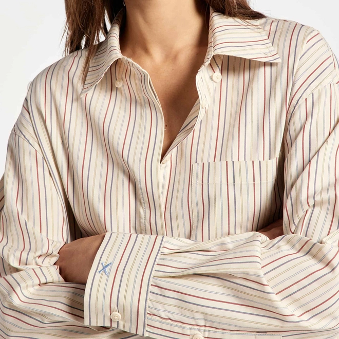 Camisa de manga longa confeccionada em tecido fio tinto de algodão, que garante conforto e toque natural. Apresenta modelagem regular, oferecendo caimento reto e solto ao corpo. Conta com bolso aplicado no peito esquerdo e pala diferenciada nas costas, composta por dois painéis diagonais, que acrescenta um detalhe sofisticado e moderno à peça.