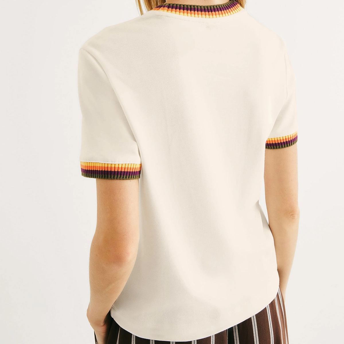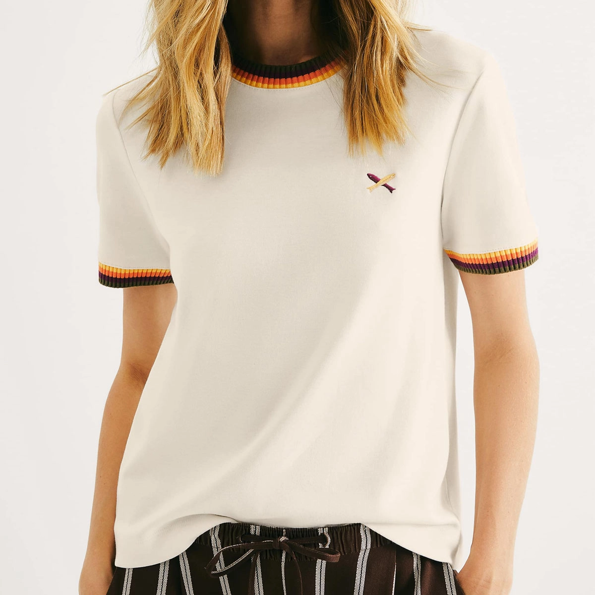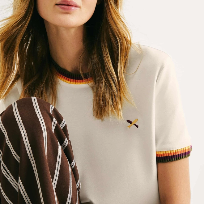 Com toque ultra macio e caimento confortável, essa camiseta une estilo e bem-estar em cada detalhe. Confeccionada em malha com acabamento premium, possui modelagem regular, levemente solta ao corpo, mangas curtas e gola redonda clássica. Os detalhes em retilínea colorida adicionam um toque moderno e despojado, enquanto o bordado no peito traz charme e identidade à peça.