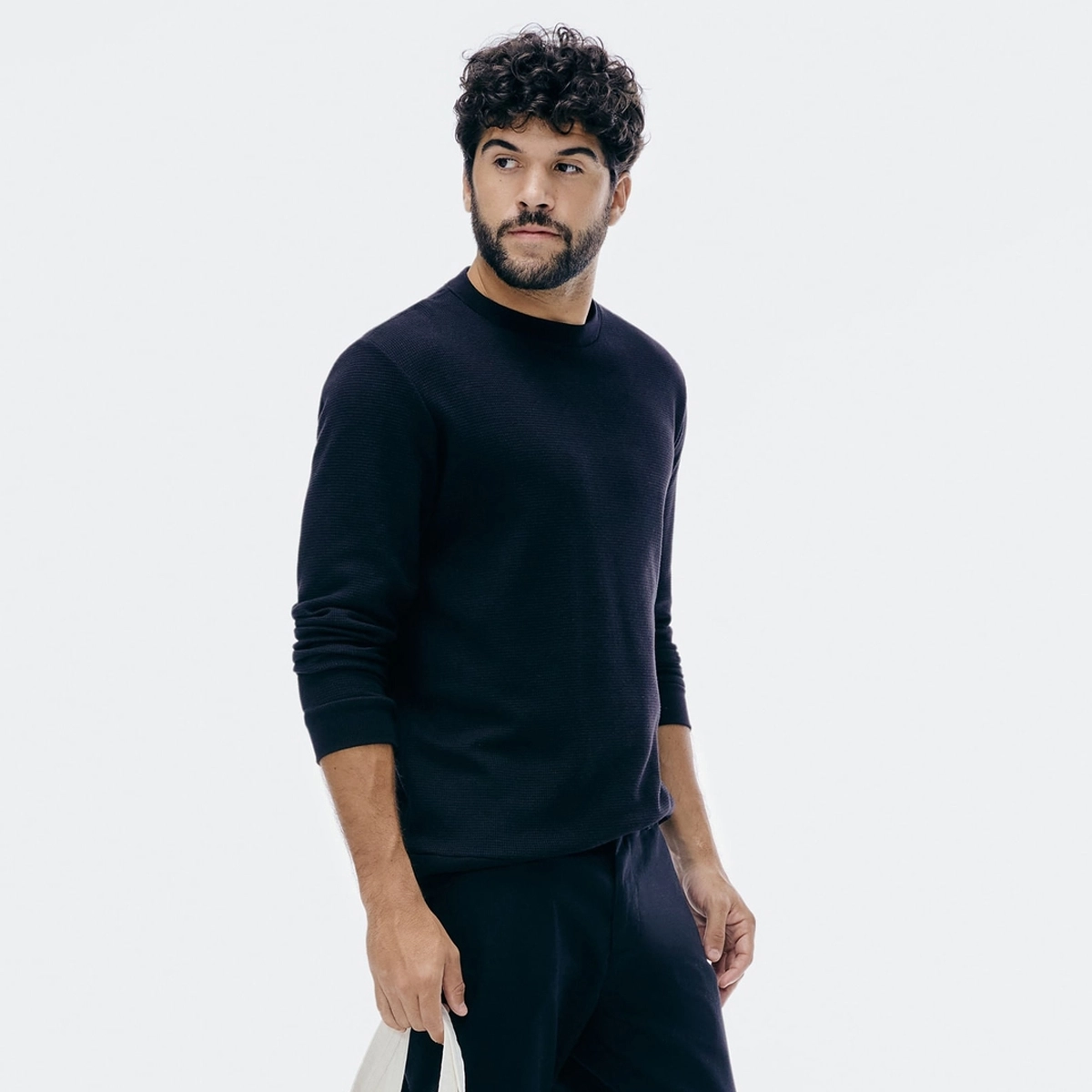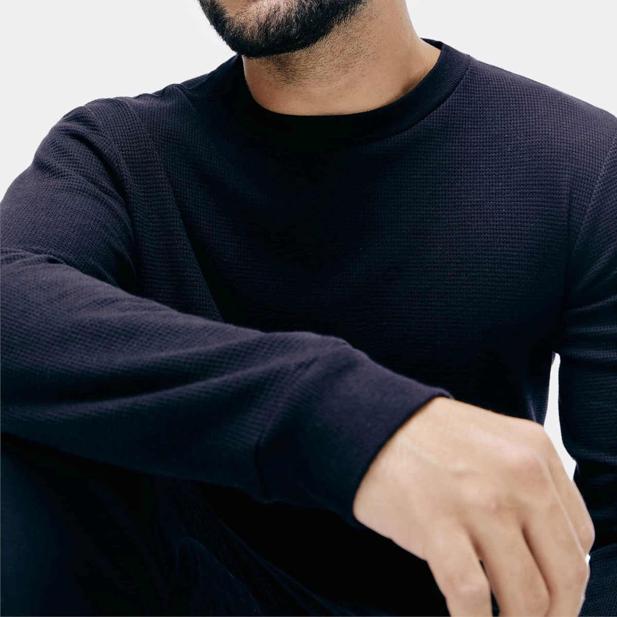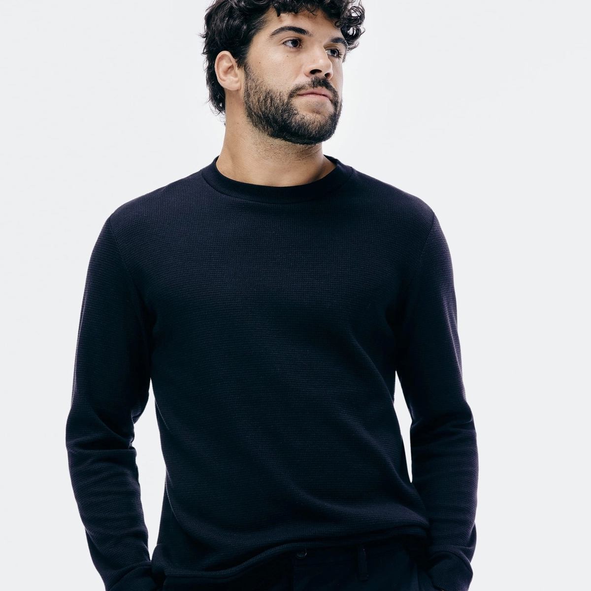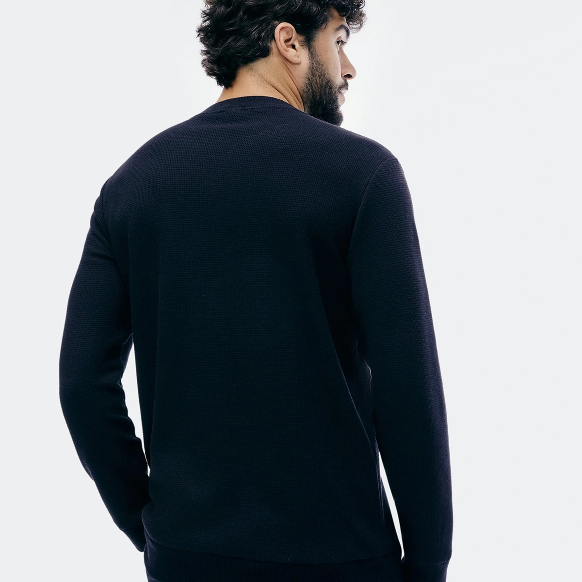 Camisa regular masculina em malha de algodão texturizada. Possui manga longa termal e gola redonda. Confortável e aquecida, perfeita para camadas e looks casuais em dias frios.