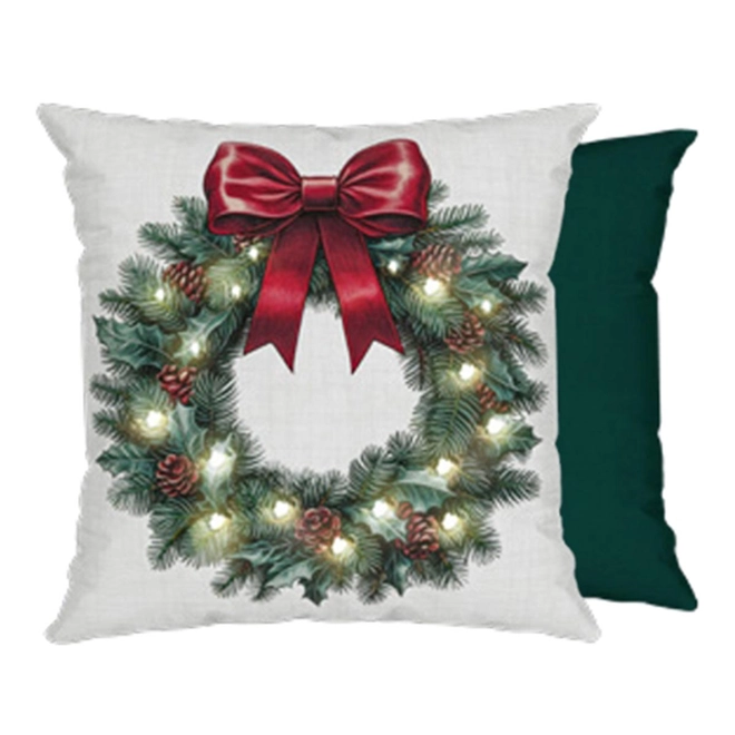 Confeccionada em velveteen com estampa de guirlanda clássica, a peça traz um diferencial encantador: luzes LED internas que piscam suavemente ao serem acionadas, criando um efeito de pisca-pisca integrado. Uma peça de alto impacto visual, ideal para lojistas que desejam surpreender seus clientes com produtos natalinos criativos, tecnológicos e irresistíveis para vitrines e composições especiais.