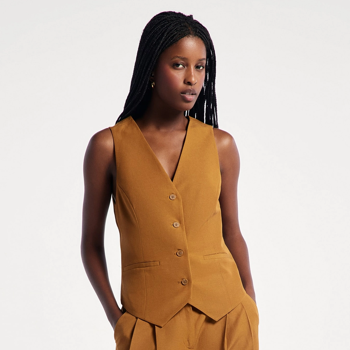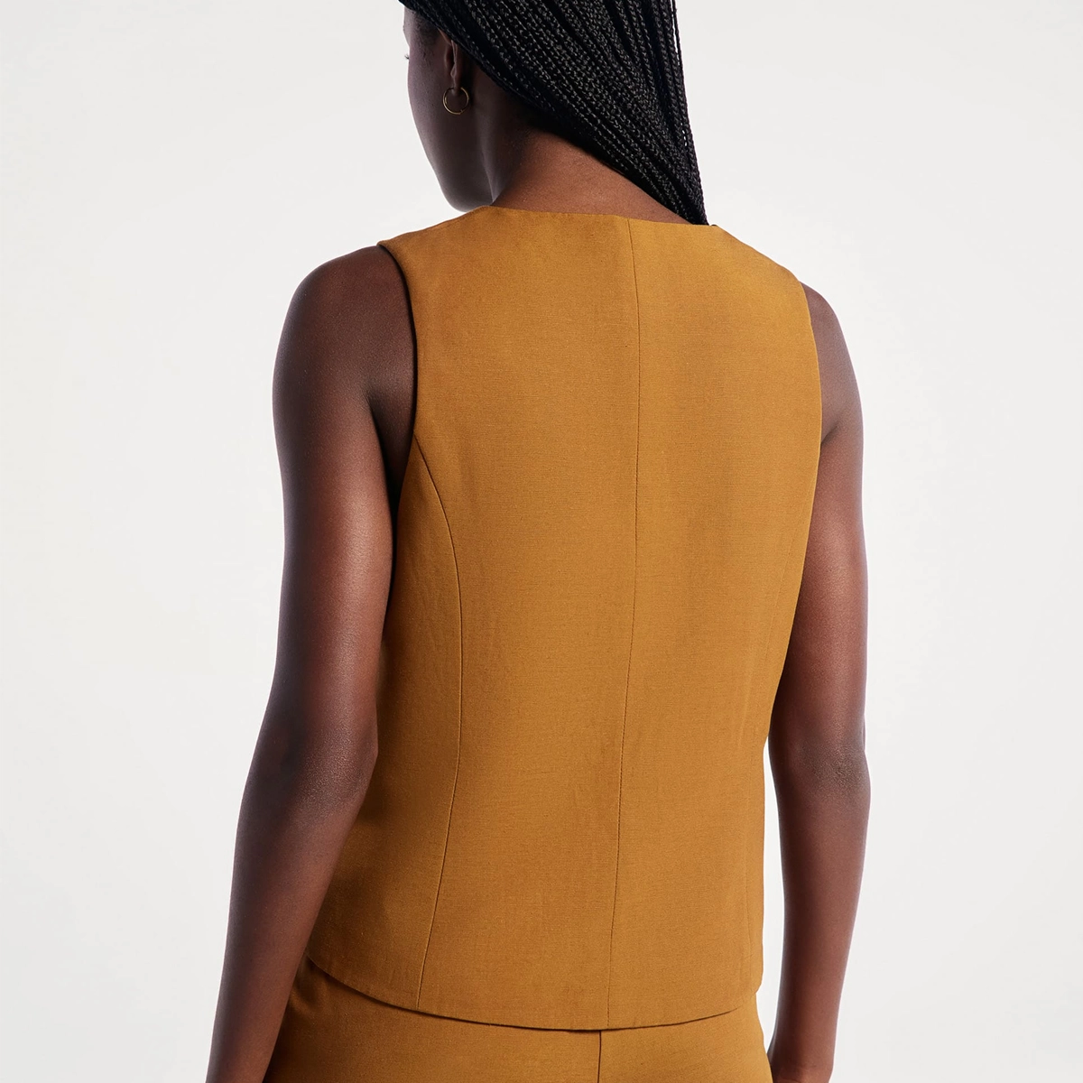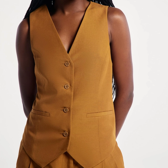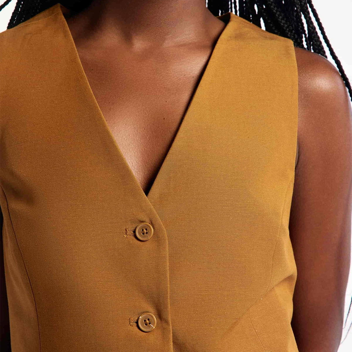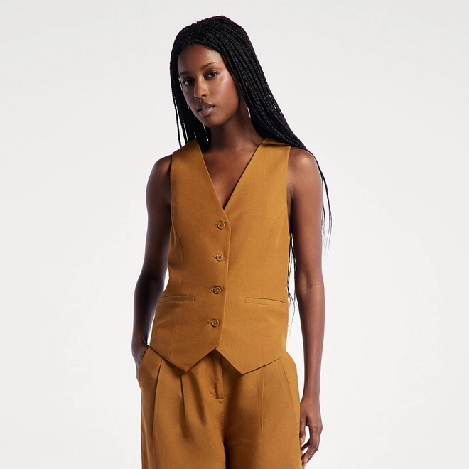 Colete alfaiatado confeccionado em tecido com linho, que garante toque natural, leveza e acabamento levemente rústico. Apresenta modelagem reta e decote em V, que alonga a silhueta e traz um ar sofisticado. Possui bolsos falsos embutidos na parte frontal e fechamento por botões, reforçando o estilo clássico e elegante da peça.