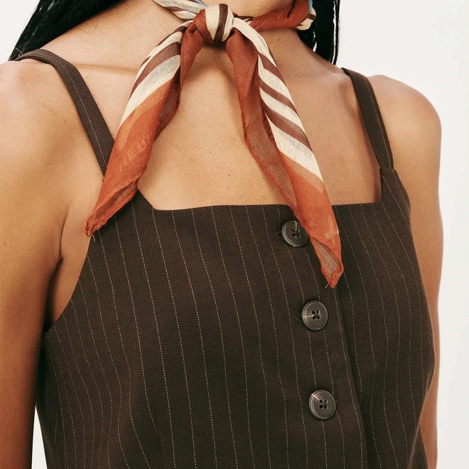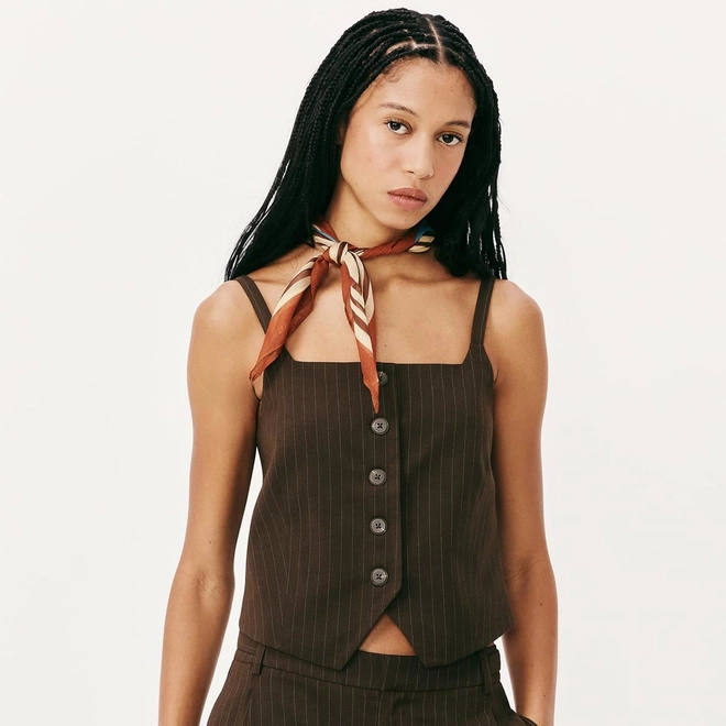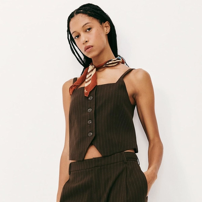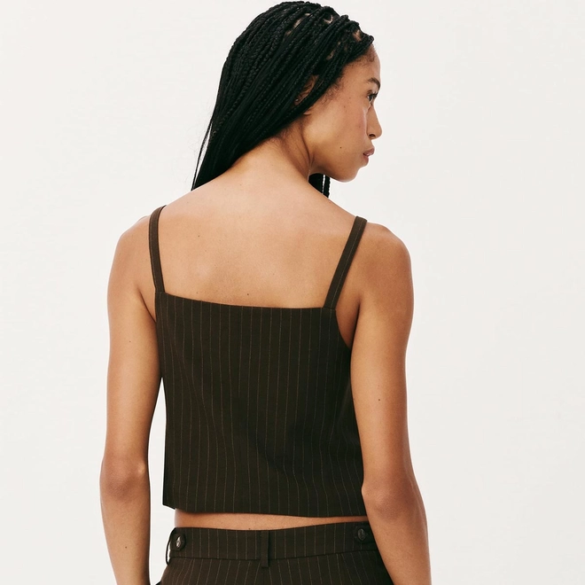 Toque moderno com acabamento clássico. Esse colete alfaiataria em tecido fio tinto, une estrutura e leveza em uma peça cheia de estilo. Com modelagem slim, mais ajustado ao corpo, alças finas e decote reto, valoriza a silhueta de forma elegante. O abotoamento frontal traz um charme extra e um ar refinado à composição.
