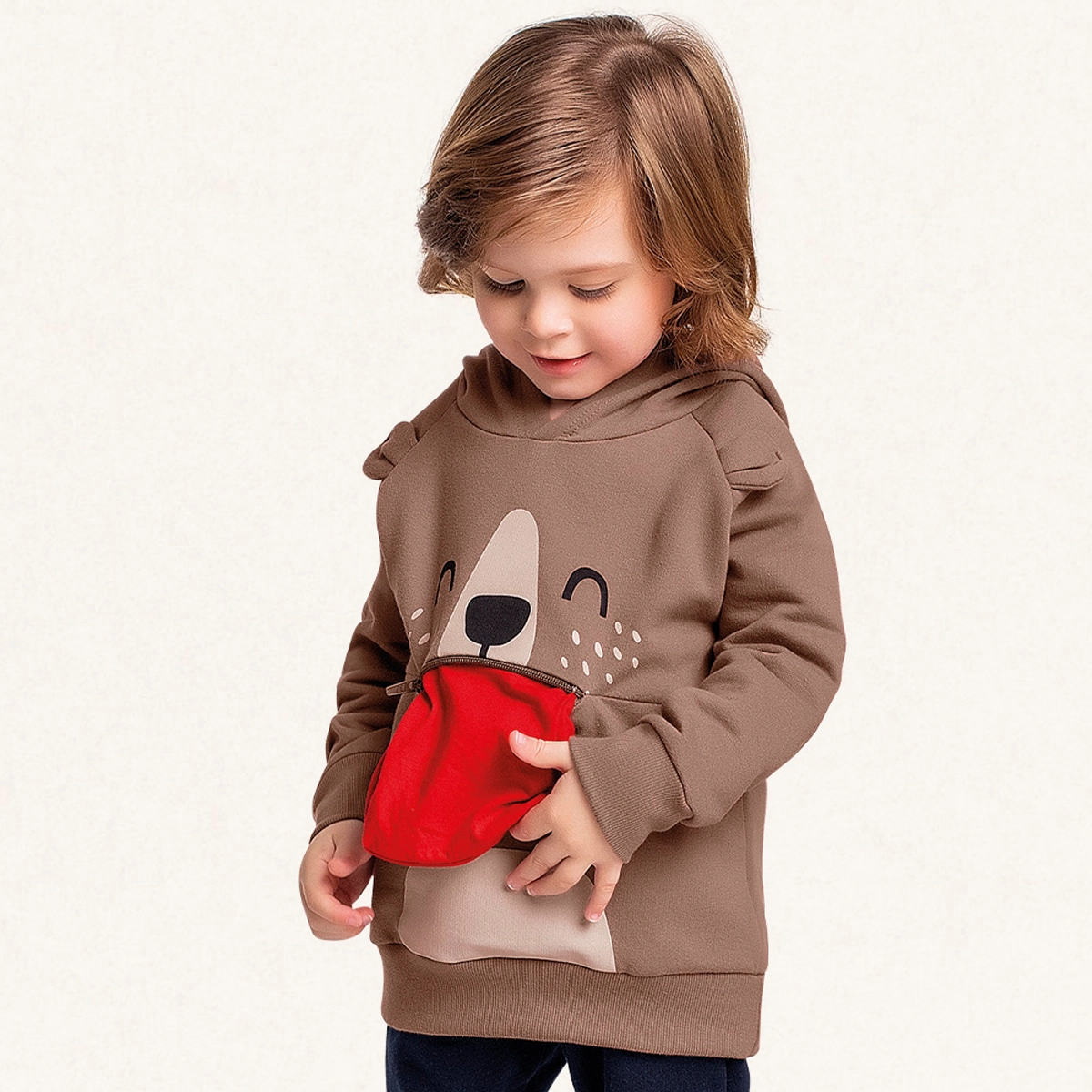 O blusão com capuz possui decote redondo, mangas longas, uma etiqueta decorativa charmosa e zíper funcional com aplique interativo, que torna a peça divertida e envolvente para as crianças. A modelagem regular e o comprimento ideal garantem um ótimo ajuste ao corpo.