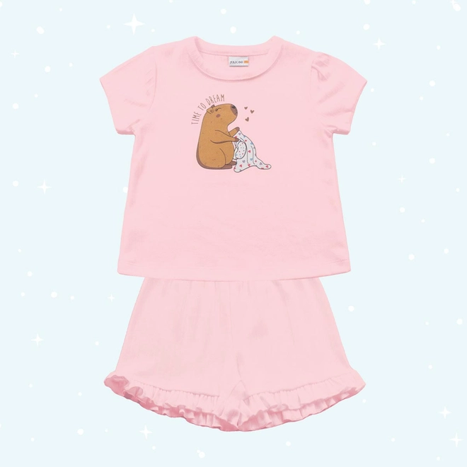 O pijama Fakini (ref. 10.25.03294) foi desenvolvido para proporcionar bem-estar, conforto e liberdade de movimentos durante o sono. Composto por blusa leve em malha macia e short confortável, é perfeito para garantir noites tranquilas e agradáveis para as pequenas.