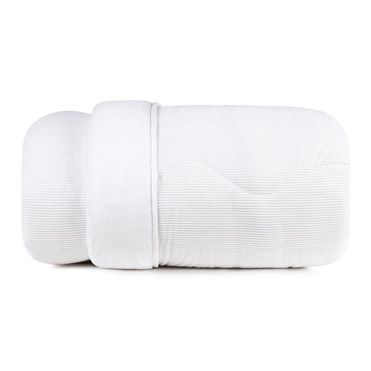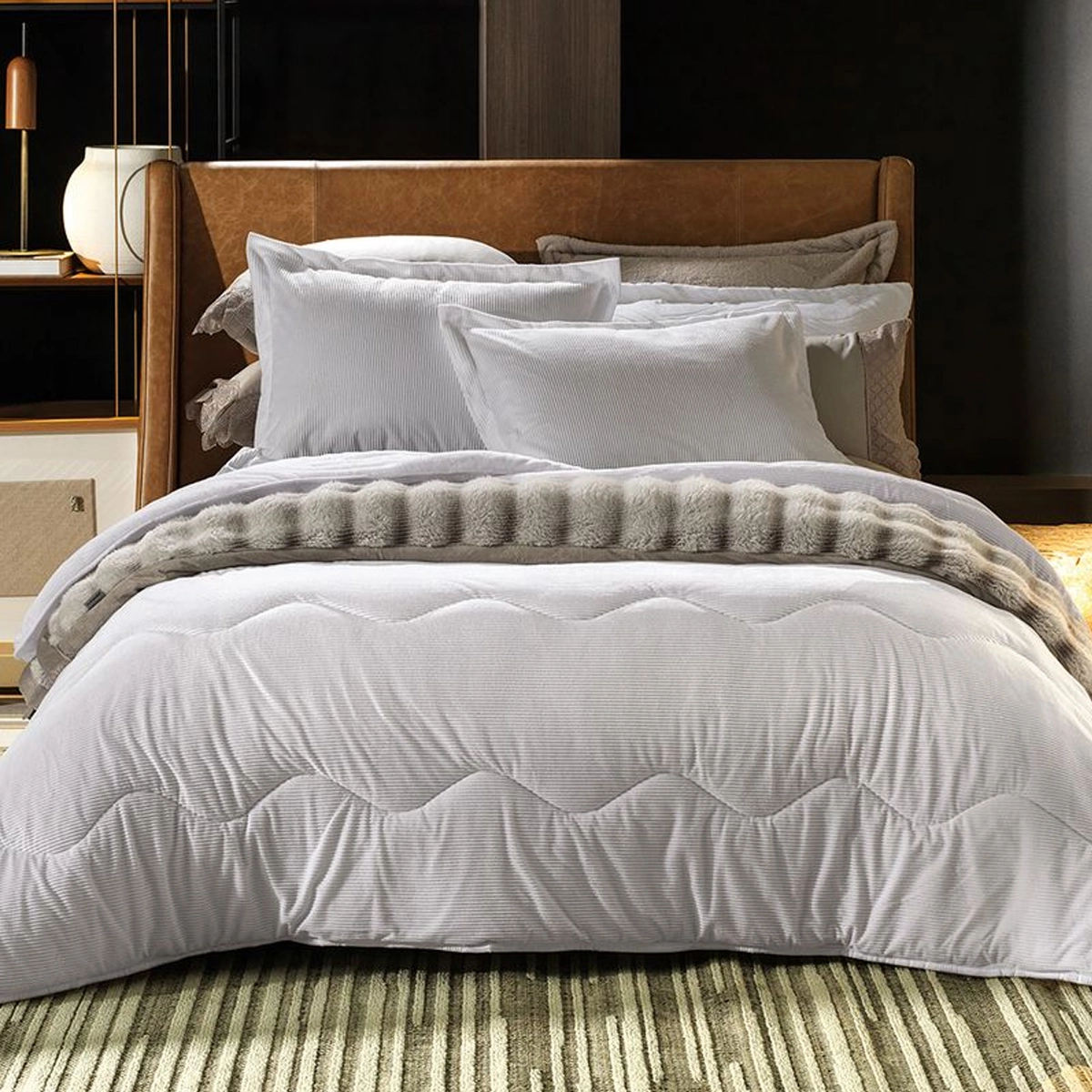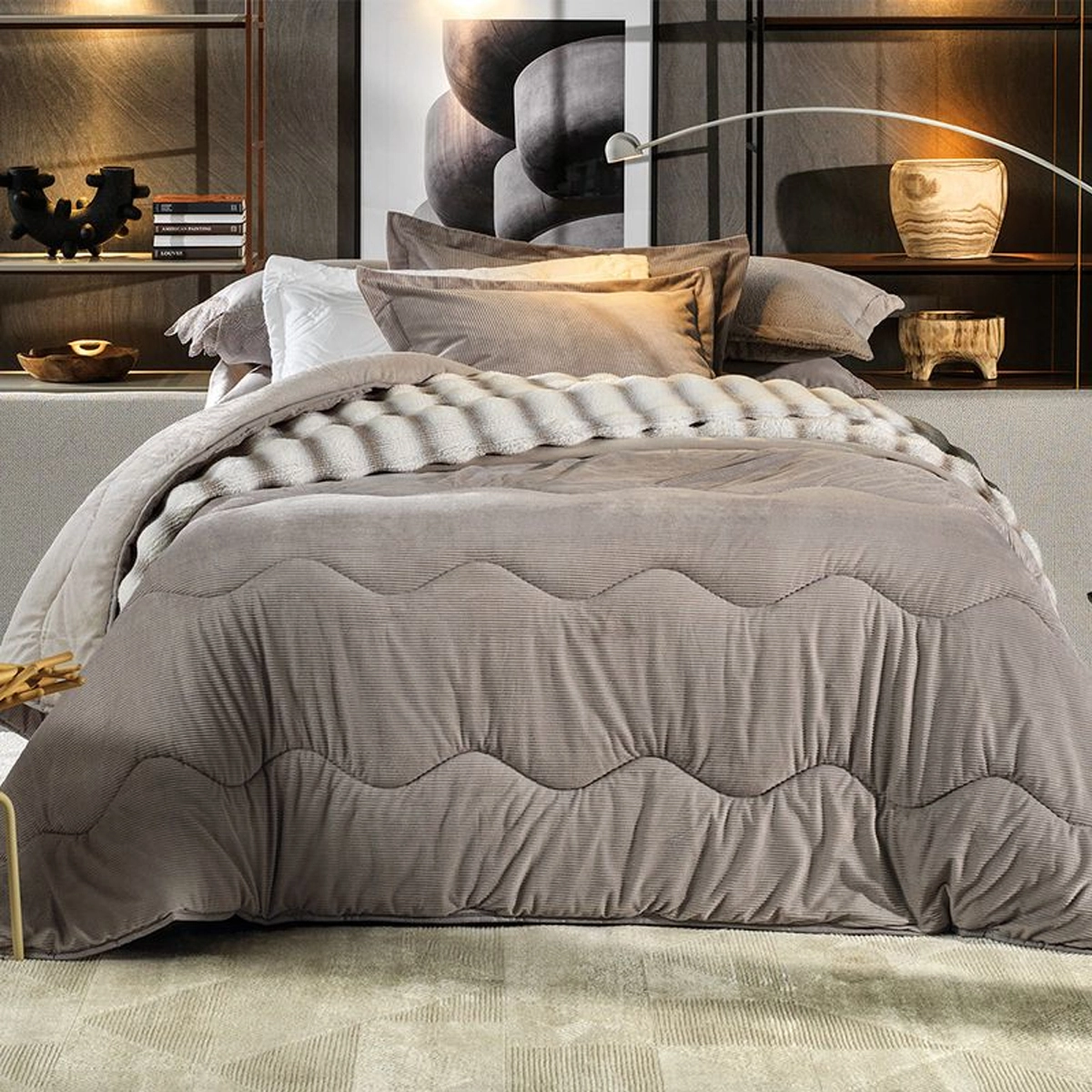 Seu lado superior em Flannel Fleece Dobby listrado (170g/m²) oferece um visual moderno com toque de sofisticação. Já o lado inferior, em PV Fleece Pile (160g/m²), proporciona uma experiência de toque macio, quente e extremamente aconchegante. O enchimento em poliéster siliconado (180g/m²) garante isolamento térmico eficaz sem pesar na cama, mantendo a leveza e o bem-estar durante o sono.