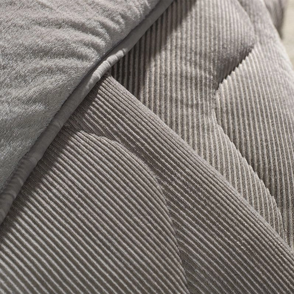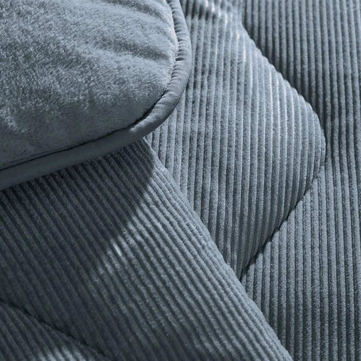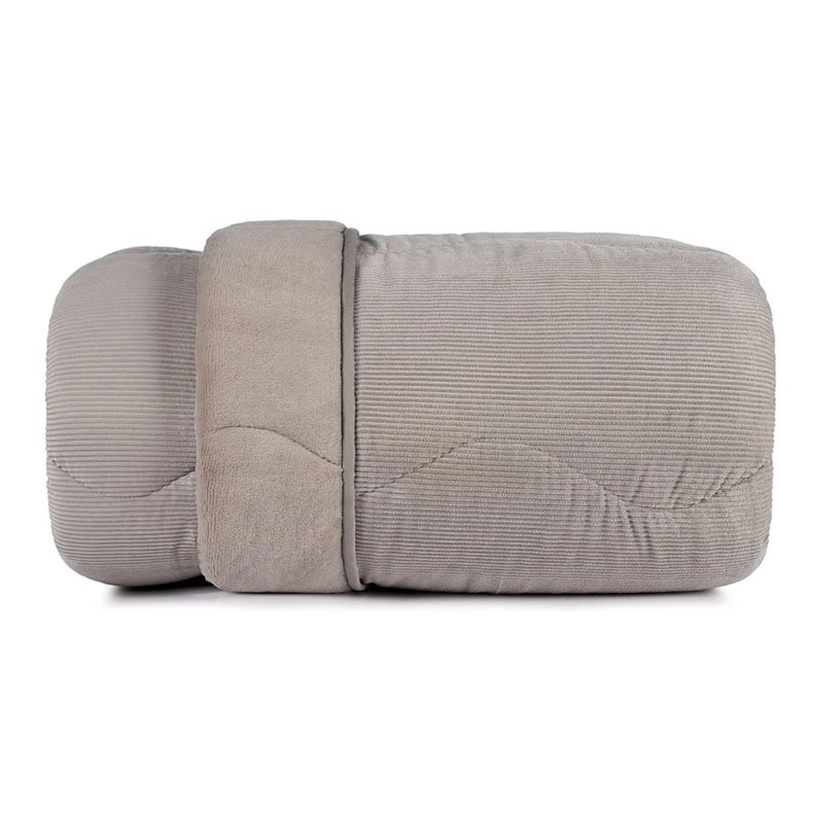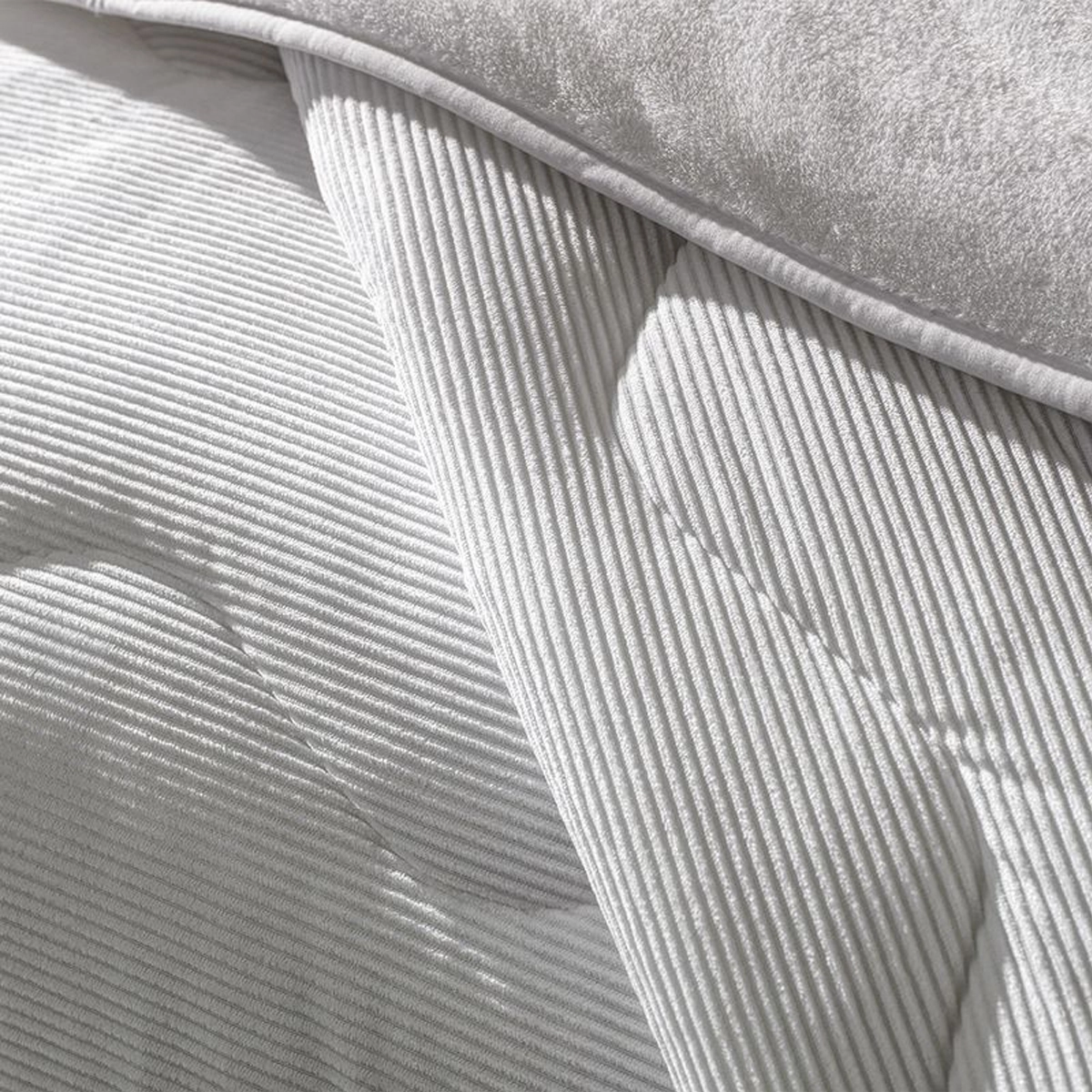 Seu lado superior em Flannel Fleece Dobby listrado (170g/m²) oferece um visual moderno com toque de sofisticação. Já o lado inferior, em PV Fleece Pile (160g/m²), proporciona uma experiência de toque macio, quente e extremamente aconchegante. O enchimento em poliéster siliconado (180g/m²) garante isolamento térmico eficaz sem pesar na cama, mantendo a leveza e o bem-estar durante o sono.