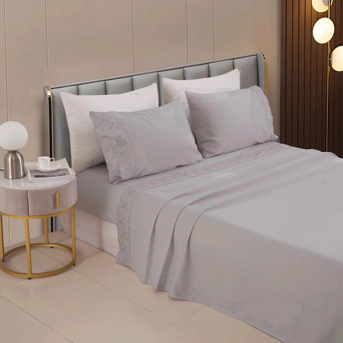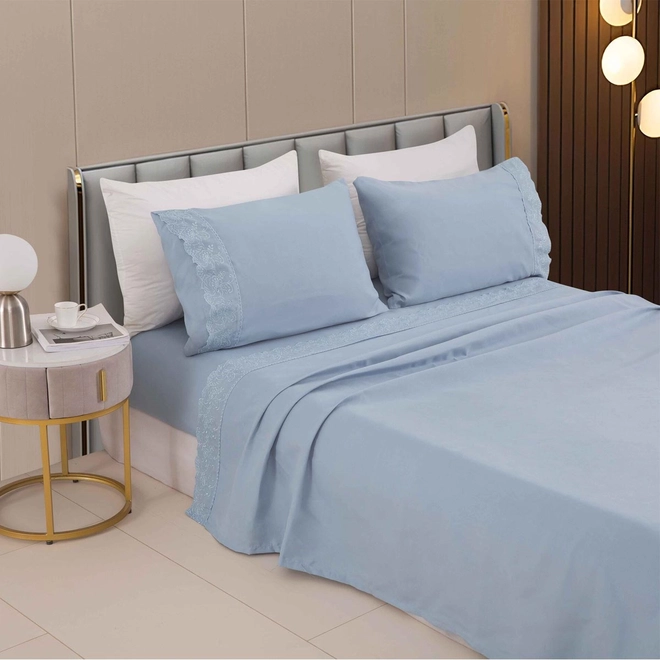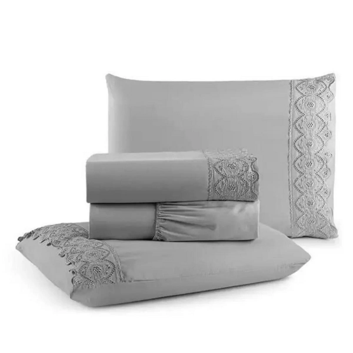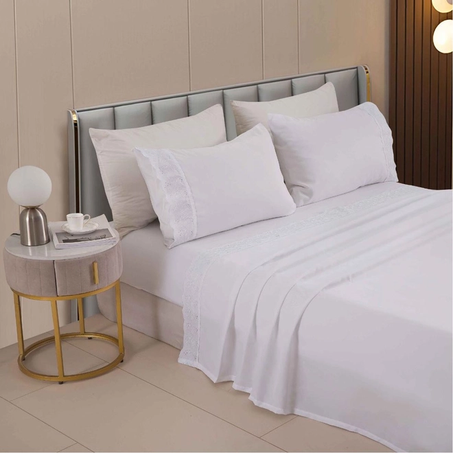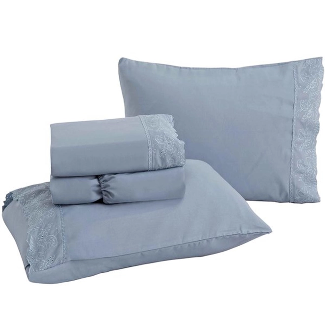 Confeccionado em Percal 300 Fios, tem um diferencial que é o bordado inglês nas fronhas e no lençol de cima, o produto se destaca em seu incrível acabamento, para quem gosta de uma cama mais luxuosa. Sem contar o toque do tecido que é macio e confortável.