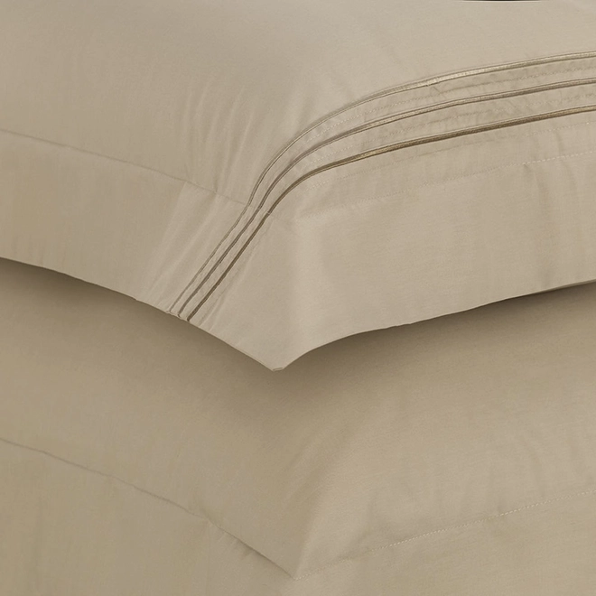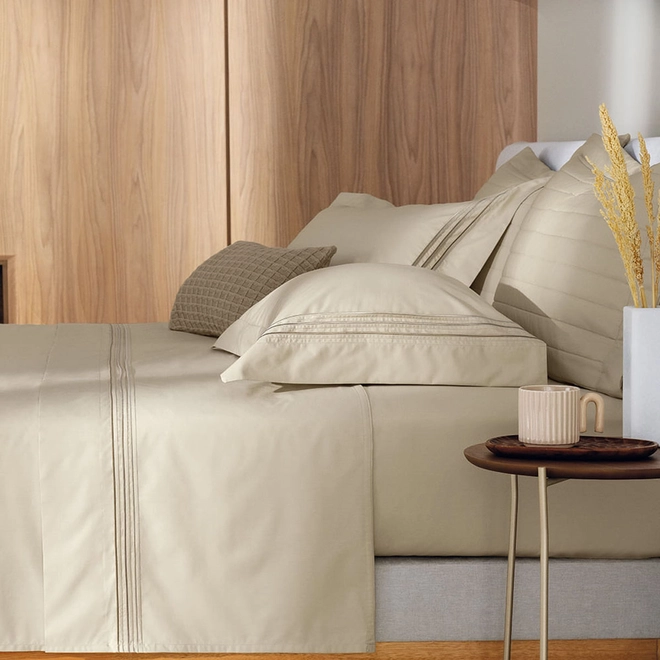 Com toque suave e visual sofisticado, o jogo de cama Menfi Queen Branco com Bege traduz o conceito da beleza discreta. Inspirado na luz dourada da paisagem italiana, destaca-se pelas aplicações em linhas bordadas que percorrem as fronhas e a dobra feita com elegância. Acompanha sobre lençol com medidas 2,40 m x 2,60 m, lençol com elástico com 1,60 m x 2,00 m x 45 cm e duas fronhas de 50 cm x 70 cm. Feito em percal 200 fios, 100% algodão, com acabamento sanforizado e mercerizado, une conforto térmico, leveza e requinte em cada noite.