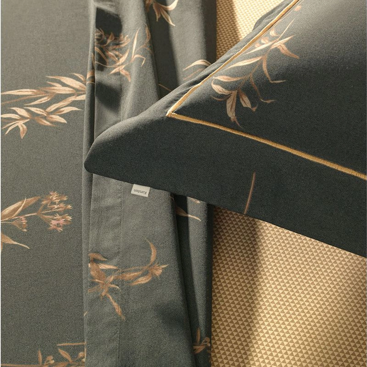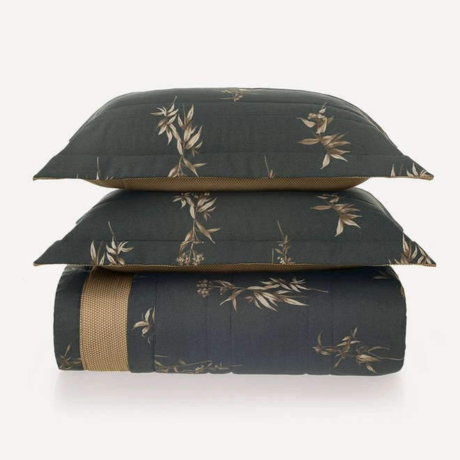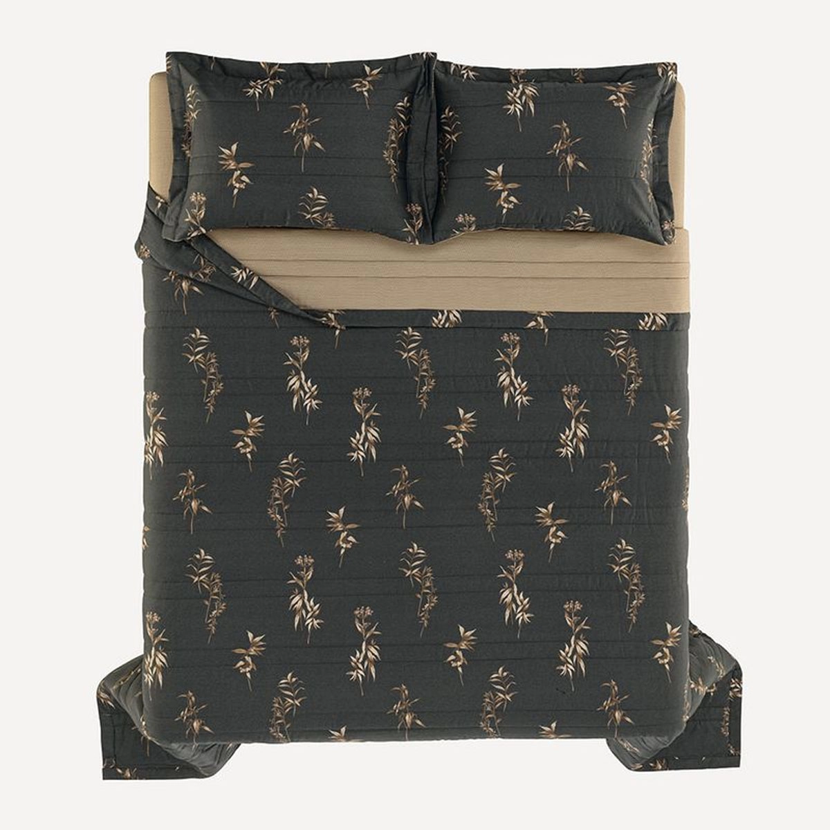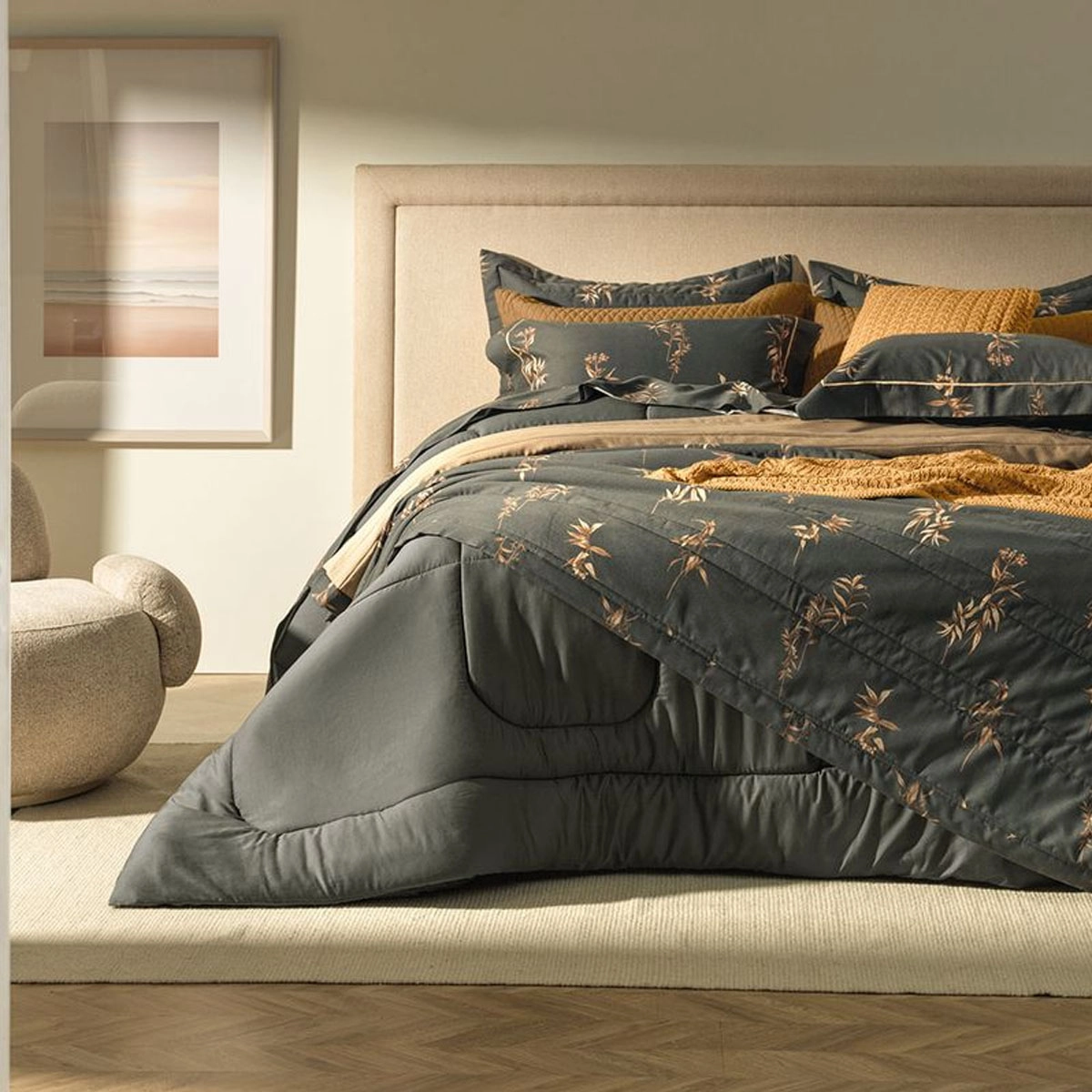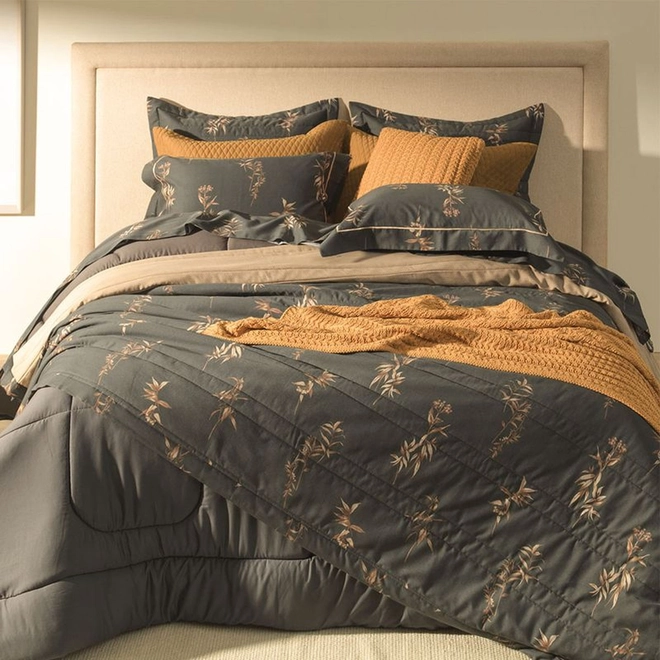 O jogo de colcha Ávila inspira sofisticação e autenticidade. A estampa da colcha e do porta-travesseiro dupla face ganham destaque pela predominância do tom de cinza profundo em contraste com flores e folhas em tons quentes. O verso apresenta uma padronagem de triângulos tom sobre tom, trazendo um ar contemporâneo para a composição. O tratamento termobond evita o deslocamento do enchimento, proporcionando mais conforto e durabilidade. Com o toque sedoso do tecido em algodão egípcio, Ávila é a cama que se destaca no quarto.