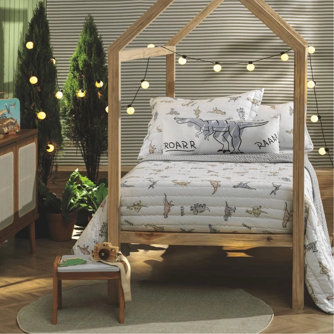 Com a estampa infantil, a hora de dormir ganha um toque mágico cheio de diversão! Estampas coloridas passeiam pelo tecido macio, trazendo alegria e imaginação para o quarto infantil. Além de superconfortável, esse conjunto transforma o momento de descanso em uma verdadeira aventura jurássica, onde os pequenos podem sonhar e explorar um mundo cheio de descobertas ao lado de seus personagens favoritos. Disponível em edredons, fronhas, jogos de cama e de colcha, é a escolha perfeita para transformar o quarto em um cenário cheio de aventuras.