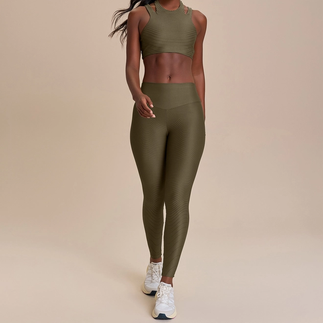 Tecido de média compressão com textura canelada e acabamento opaco, oferece ajuste firme ao corpo com zero transparência e visual sofisticado. Desenvolvido com tecnologia inclusiva LYCRA® ADAPTIV, adapta-se com conforto às formas do corpo e favorece a liberdade de movimento. Conta com proteção UV 50+, ideal para atividades ao ar livre, e tecnologia Easy Care, que facilita os cuidados diários ao reduzir a necessidade de passar. O processo de tingimento com redução no consumo de água reforça o compromisso com a sustentabilidade.