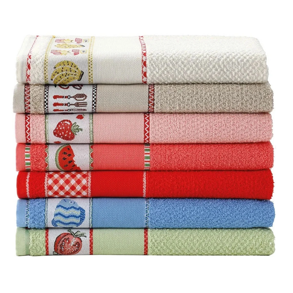 O Pano de Prato Atoalhado Picnic possui barrado para bordar com 40 pontos, tecido felpudo, uma ótima absorção e barrado com diversas estampas em jacquard.