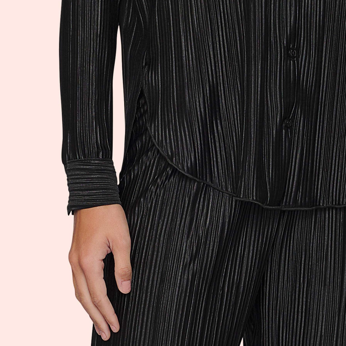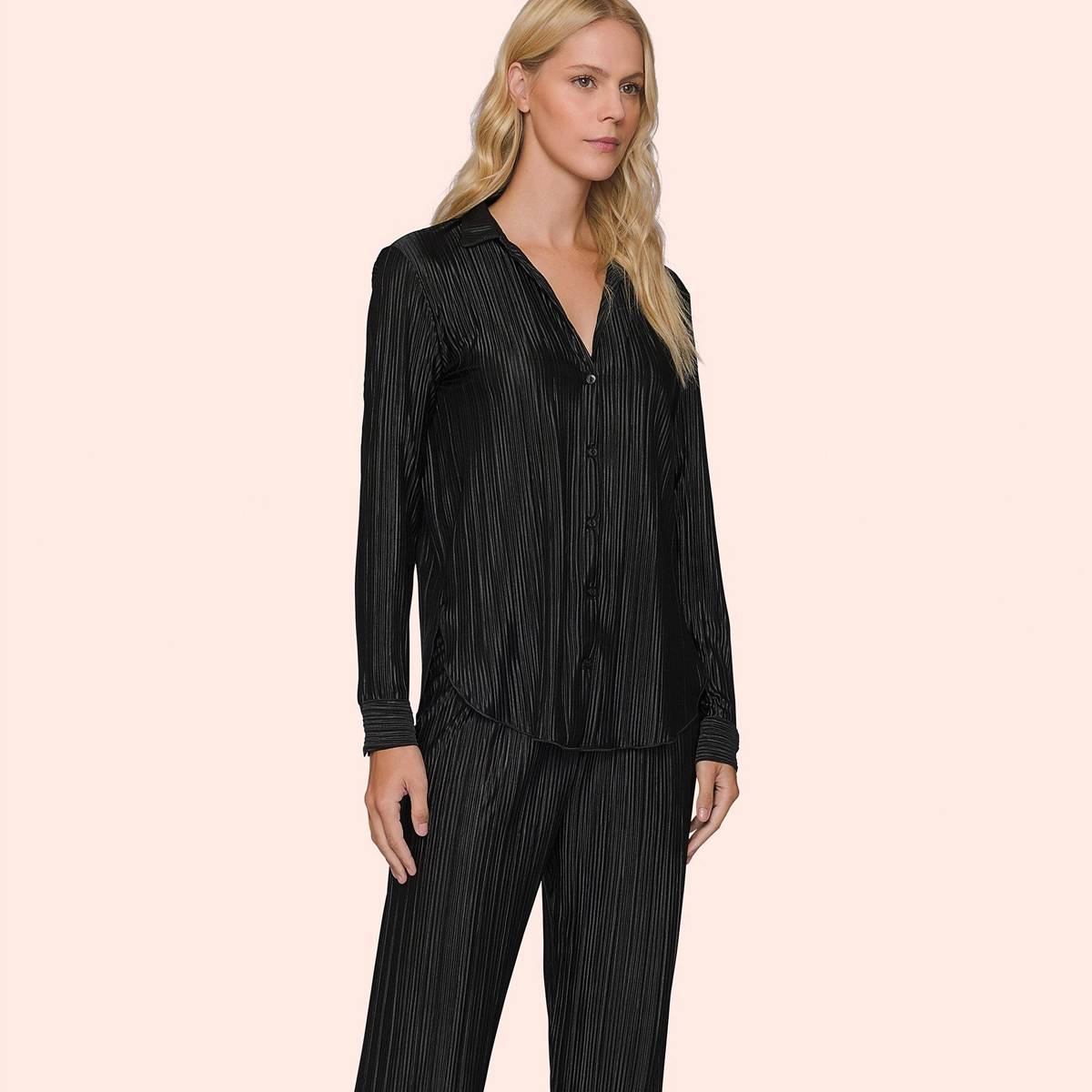 Conforto e elegância se unem neste pijama feminino confeccionado em tecido plissado flow, que proporciona um caimento leve, fluido e com um discreto toque de brilho. A blusa apresenta modelagem solta, gola clássica e fechamento frontal por botões, além de mangas longas com punhos delicados. O short tem modelagem levemente ampla e conta com elástico na cintura, garantindo ajuste perfeito e liberdade nos movimentos.