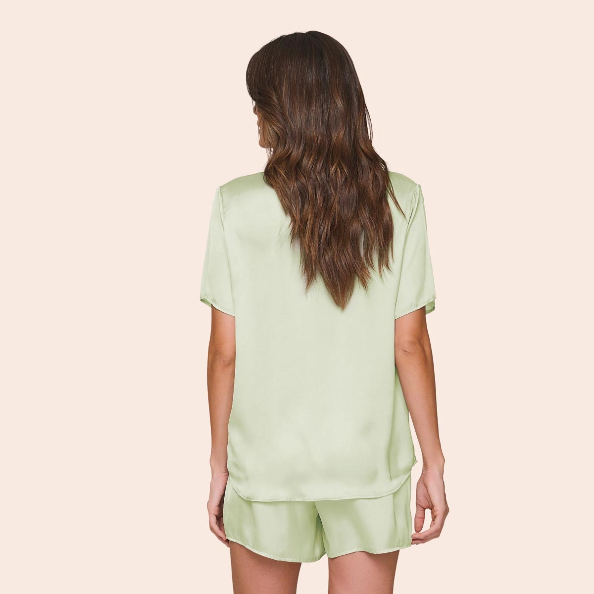 Pijama Aberto Feminino em Satinê Camisa com Botões e Shorts Fresh Mint