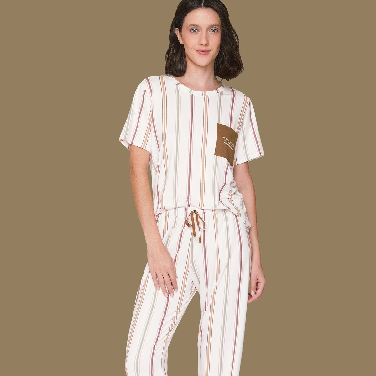 Pijama casua feminino casual, confeccionado em sublime touch de toque aveludado. A modelagem é atemporal, com blusa de manga curta, bolso em cor contrastante e estampa. A estampa de listras é clássica em todas as coleções, porém renovada em cores e texturas seguindo as tendências da estação.