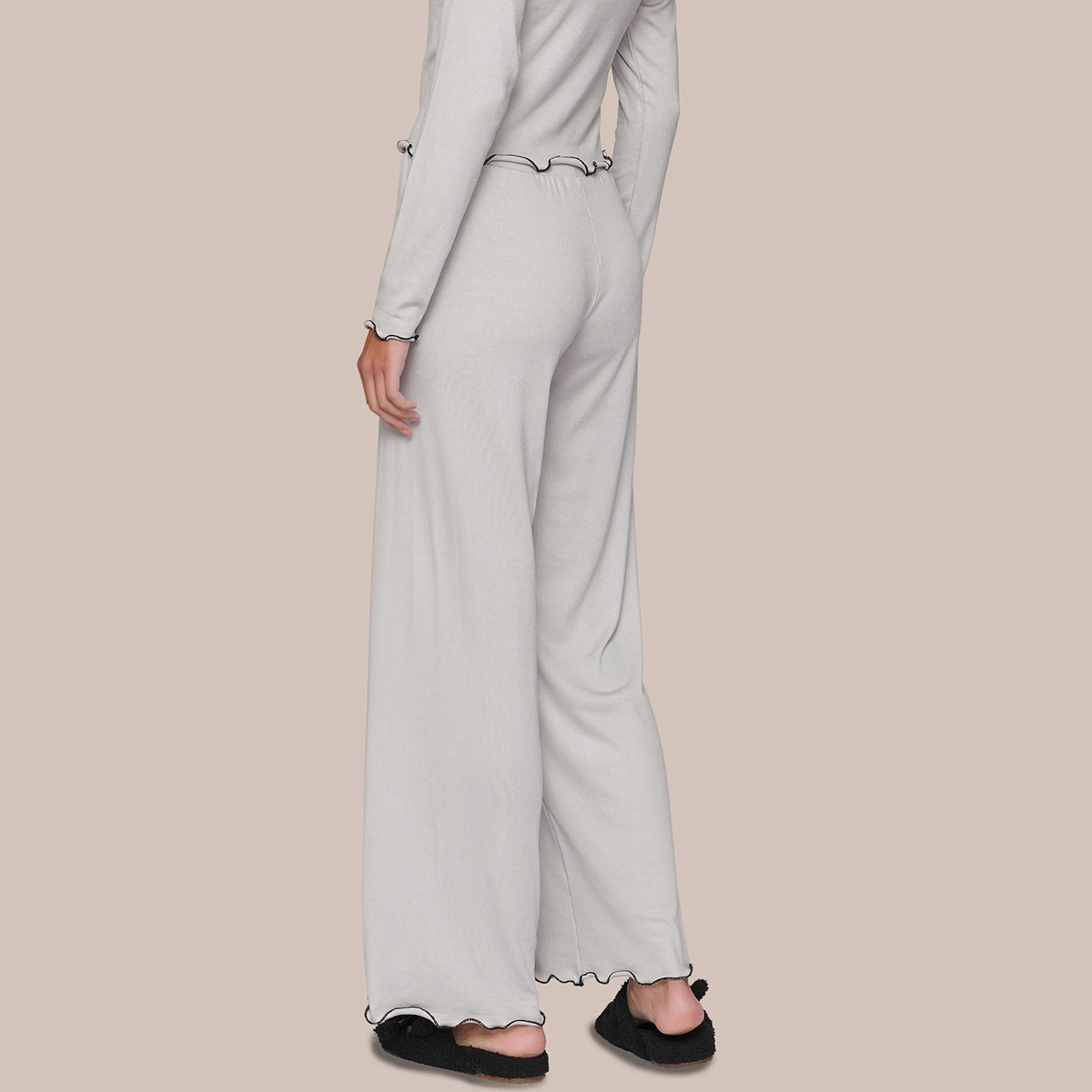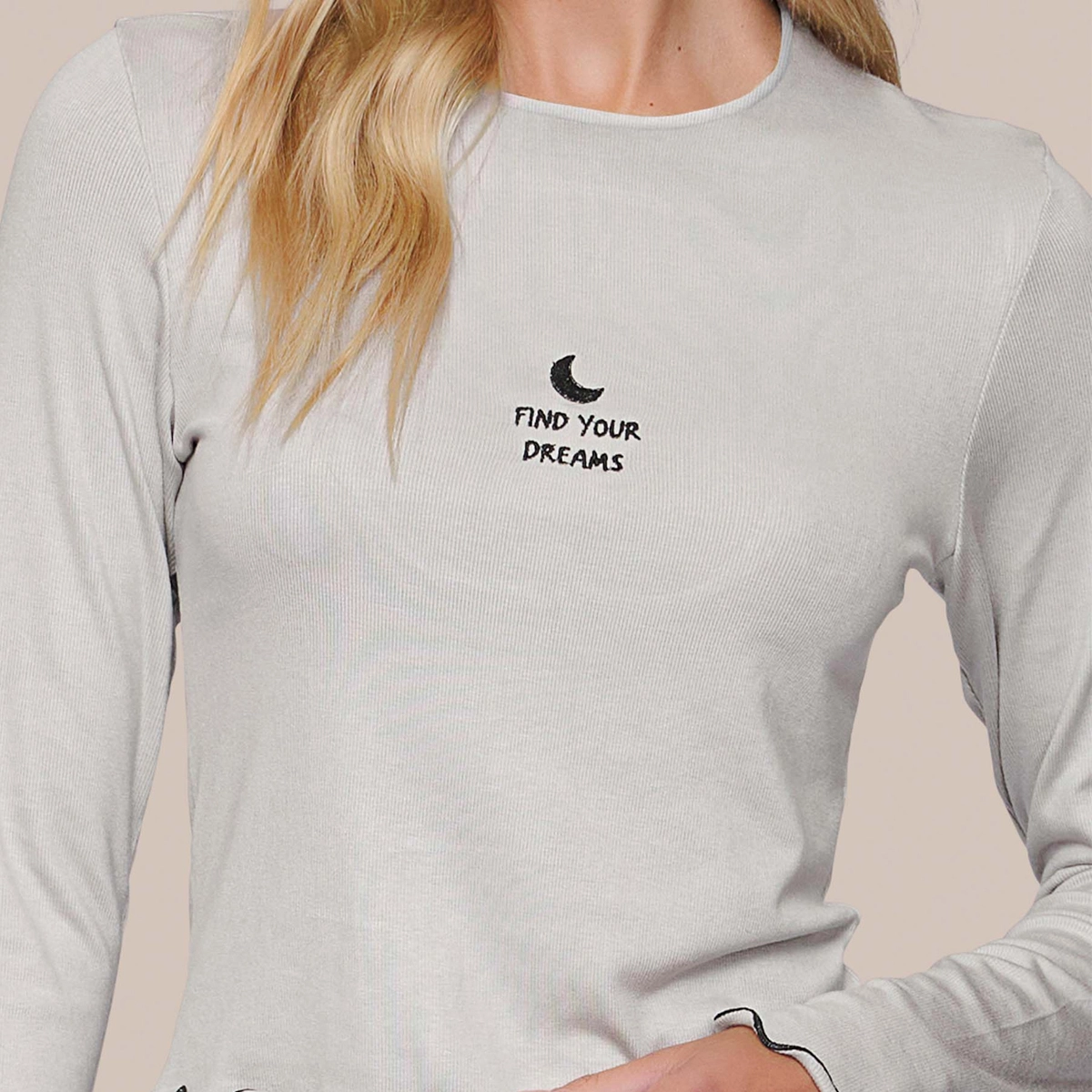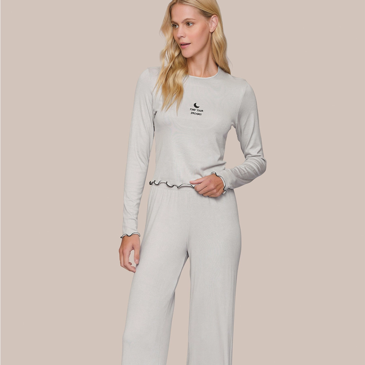 Confeccionado em canelado modal, este pijama comfort oferece um toque super confortável e macio. A blusa de manga longa apresenta um bordado na parte frontal, enquanto as mangas são adornadas com um acabamento em frufru em cor contrastante, adicionando um charme especial à peça. A calça, de modelagem ampla, conta com elástico na cintura para garantir um ajuste seguro e confortável, tornando este pijama perfeito para momentos de relaxamento com estilo.