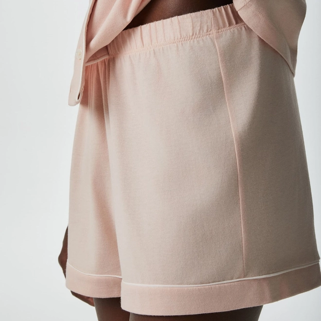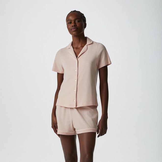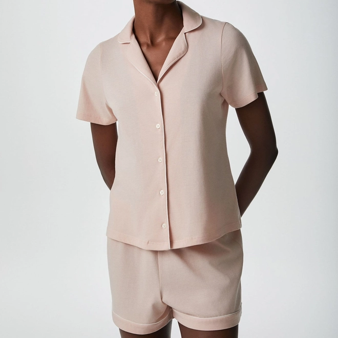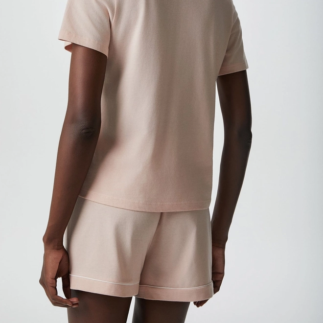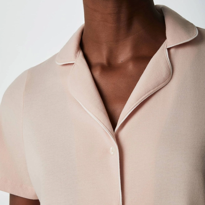 Pijama curto feminino com botões, para noites de sono tranquilas. Pijama elaborado Malha de algodão, composto por camisa manga curta e shorts curto com elástico. Detalhe de debrum contrastante na vista da camisa e na barra do short, valorizando o conjunto.
