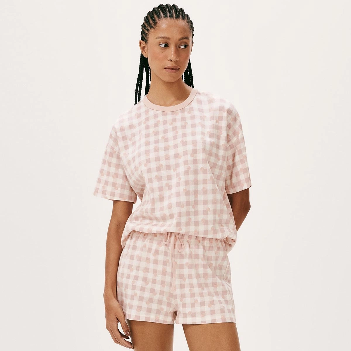 A blusa com modelagem oversized, mangas curtas e decote redondo proporciona um caimento solto e confortável. Já o shorts de cintura alta com cós elástico oferece liberdade de movimentos e ajuste ideal ao corpo. A estampa rotativa exclusiva confere um visual moderno, leve e descontraído, tornando cada peça única.