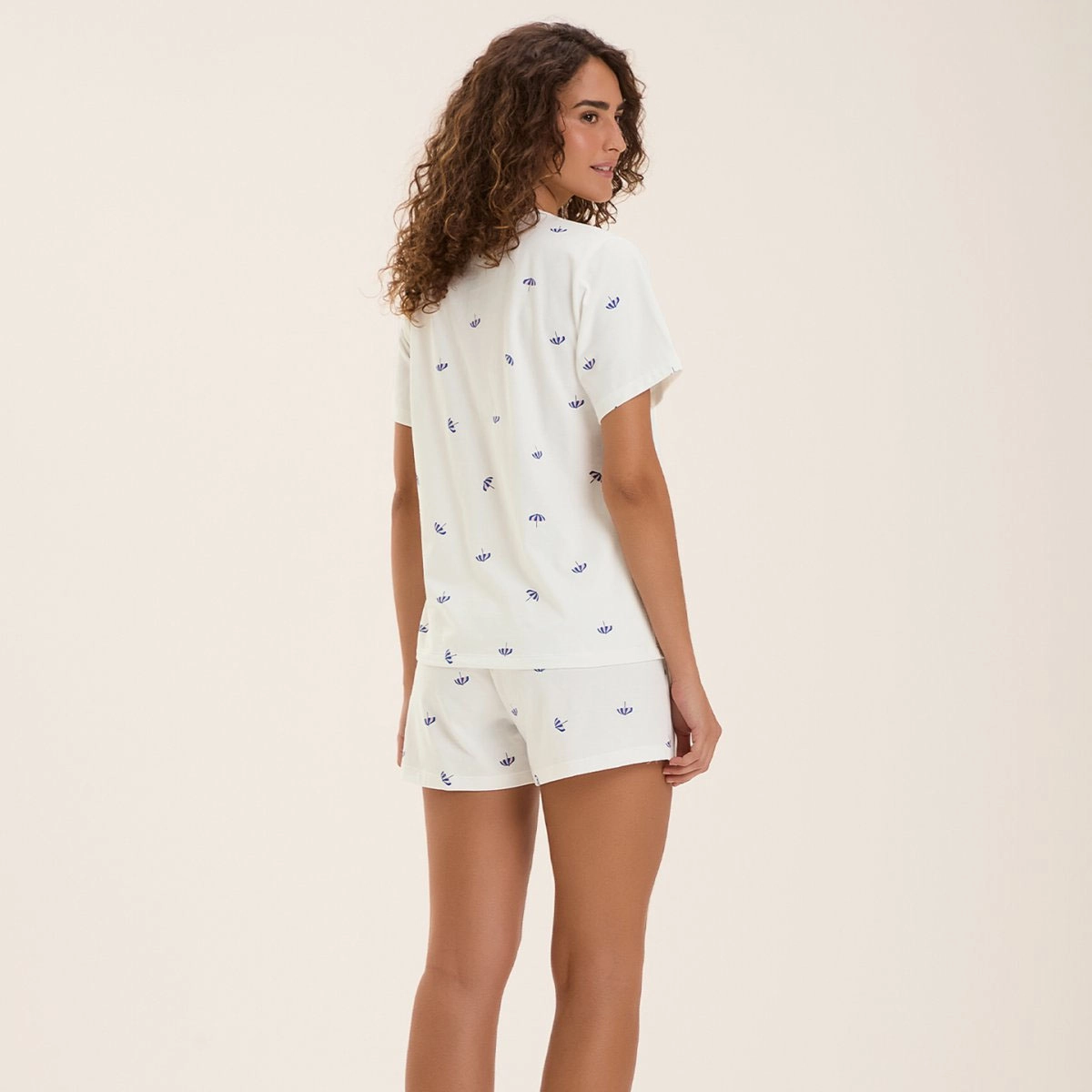 Confeccionado em malha comfort, que garante um toque macio, frescor e ótimo caimento, o conjunto possui fundo off-white e uma estampa rotativa de mini guarda-sóis, trazendo uma atmosfera descontraída e perfeita para o verão.