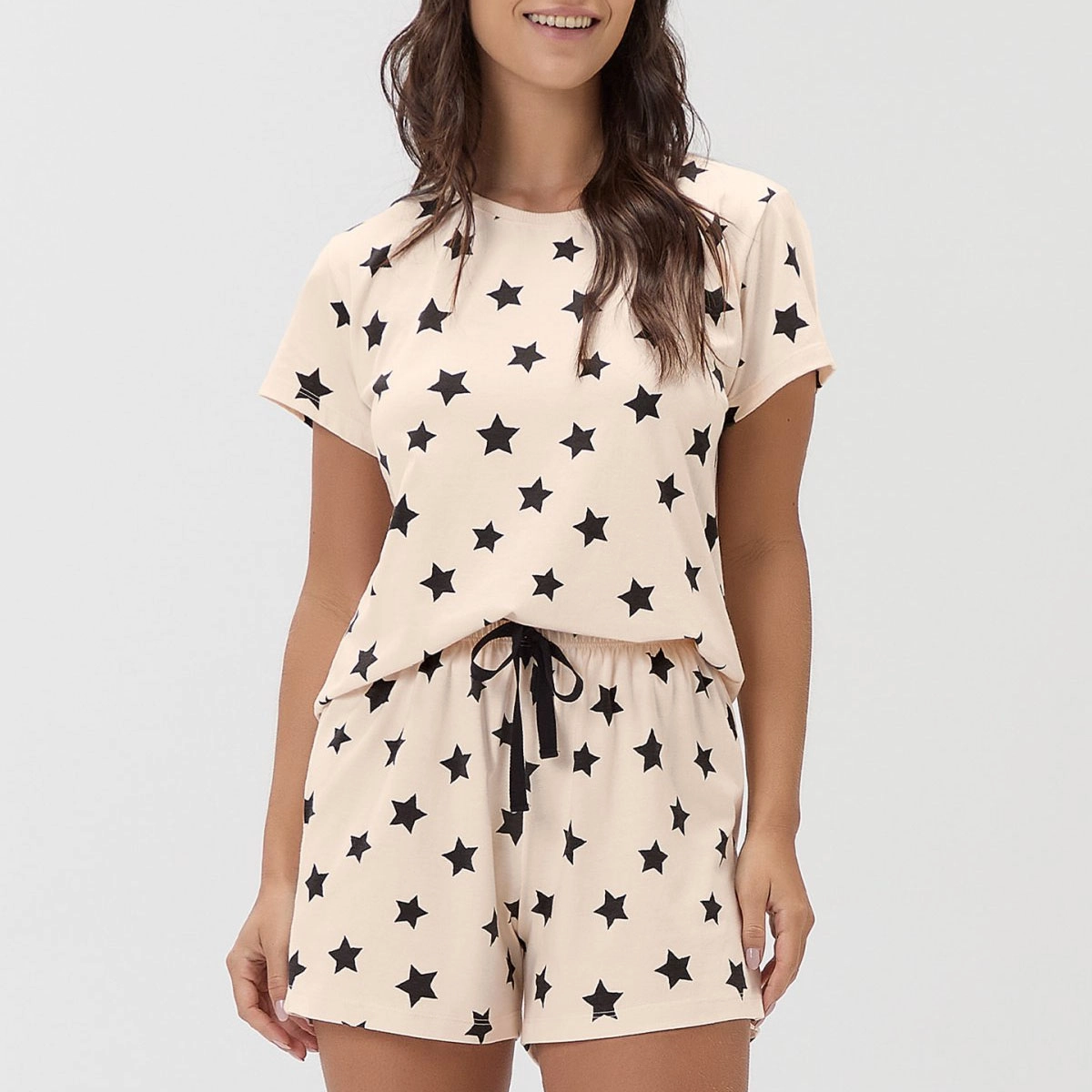 A blusa de manga curta apresenta estampa rotativa de estrelas, trazendo um visual delicado e divertido. O shorts combinando conta com detalhe em laço decorativo de poliamida no cós, adicionando um toque feminino e sofisticado ao conjunto.