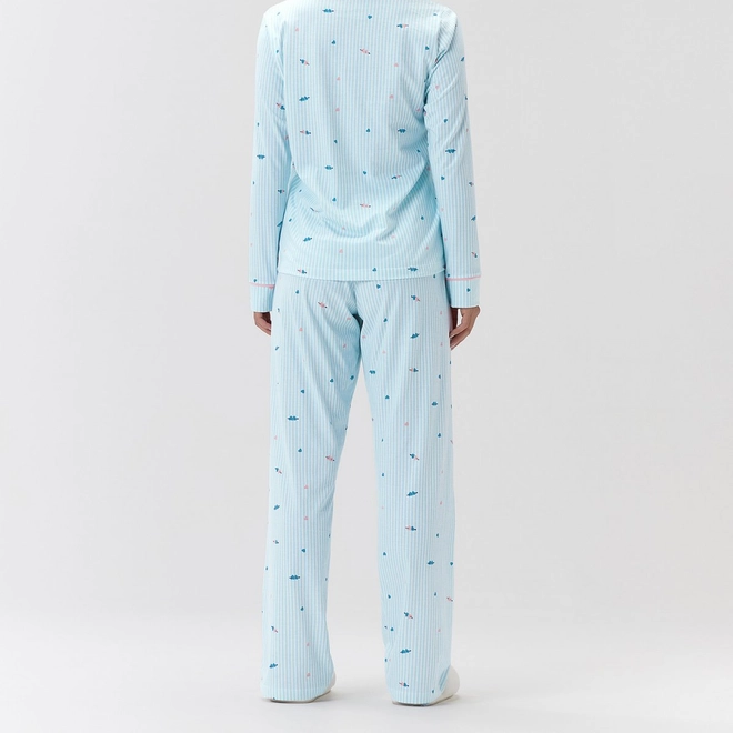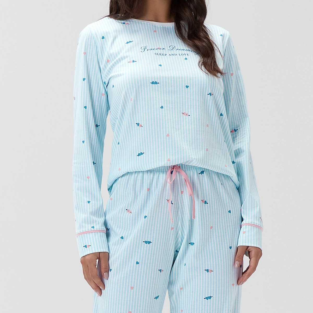 Para noites acolhedoras e cheias de estilo. Confeccionado em malha comfort leve e macia, esse pijama traz estampa de listras finas em azul claro sobre fundo off-white, com delicadas interferências de corações em tons de azul e rosa — uma combinação romântica e suave.