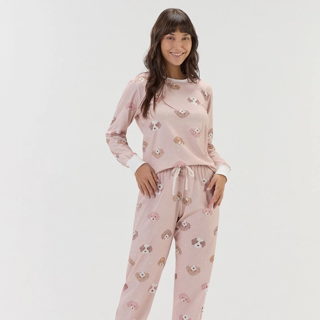 A blusa de manga longa possui fundo rosa com estampa rotativa digital de várias cabeças de labradoodles multicoloridas, trazendo um visual alegre e divertido. Os punhos em canelado proporcionam ajuste confortável e caimento perfeito, conferindo sofisticação ao conjunto.