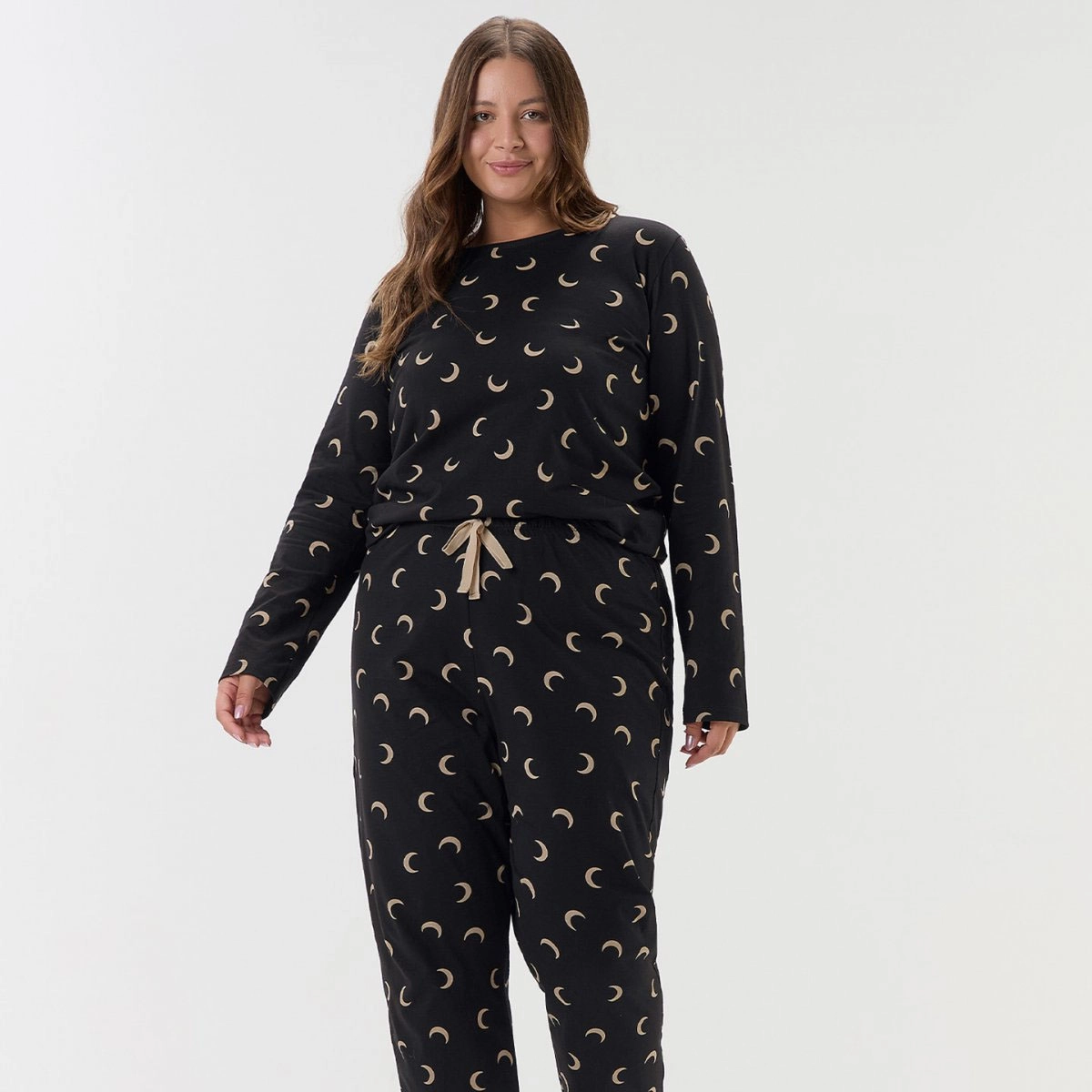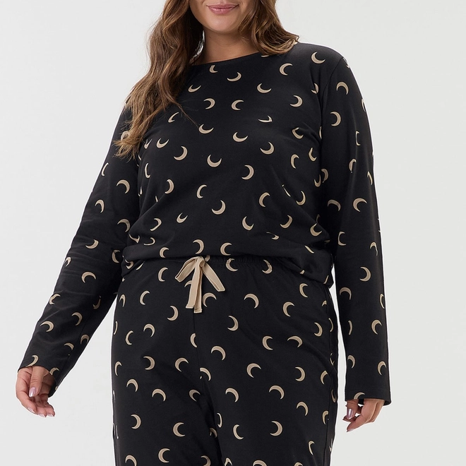 Pijama composto por blusa de manga longa e calça jogger, confeccionado em malha comfort de toque suave e agradável, que oferece conforto e respirabilidade durante o uso. A peça apresenta estampa rotativa de meias-luas desenvolvida na técnica de corrosão, garantindo um visual moderno e efeito delicadamente desgastado. A calça possui cós com elástico interno e cadarço decorativo, com base de modelagem jogger, que adiciona um charme extra ao conjunto. Ideal para noites de descanso ou momentos de relaxamento, o modelo combina estilo, leveza e praticidade em uma proposta contemporânea e confortável.