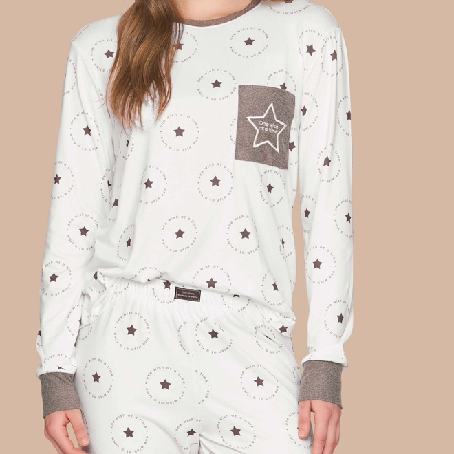 Pijama jogger confeccionado em sublime touch com toque aveludado e estampa com feito carimbo das estrelas, este coordenado recebe um contraste de combinação perfeita. A blusa com decote redondo, manga longa com punho e bolso com bordado de estrela em alto relevo. A calça com elástico na cintura e etiqueta decorativa.