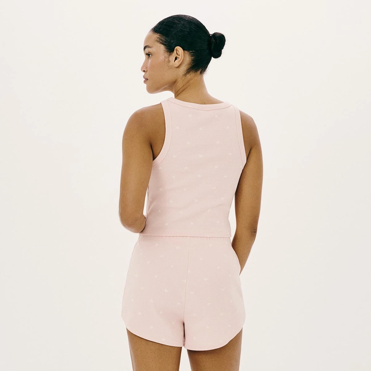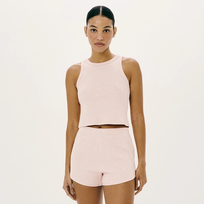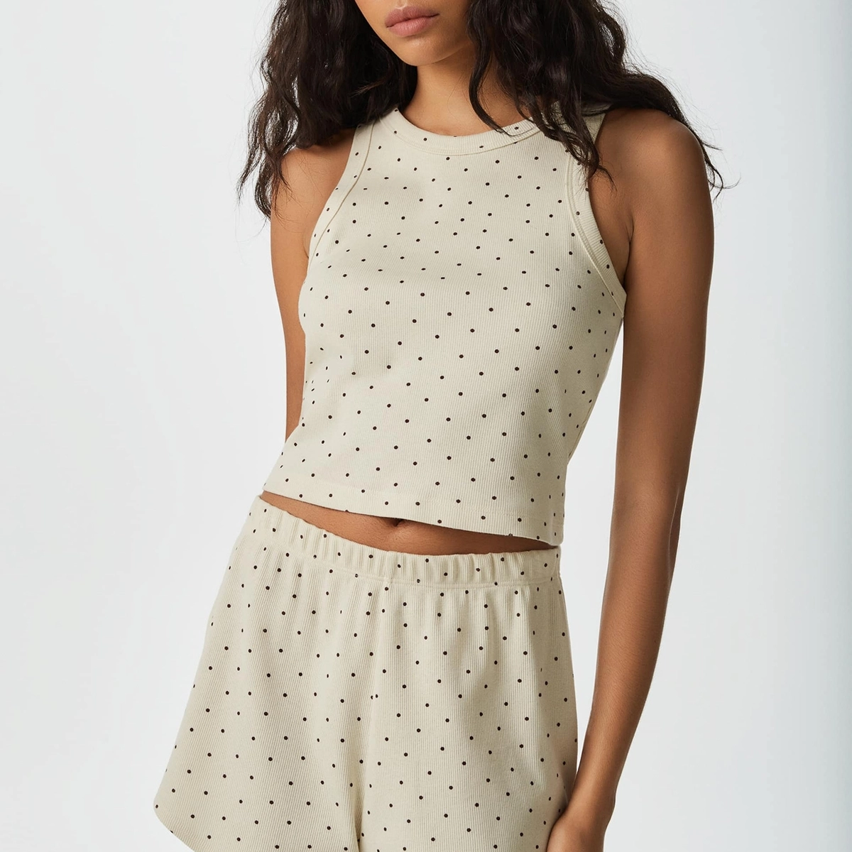 Pijama curto feminino estampado, elaborado em malha de ribana, que possui uma textura canelada e elástica. É durável e muito confortável, composto por uma regata nadador e um shorts com cós de elástico. Ambos se destacam pelo seu estampado romântico e delicado.