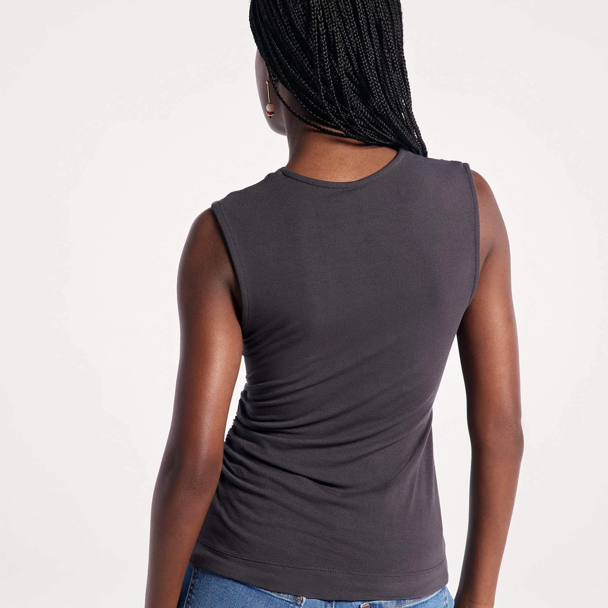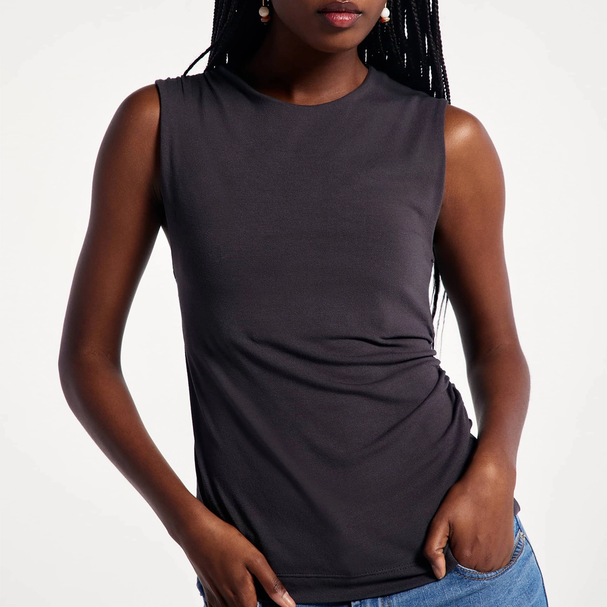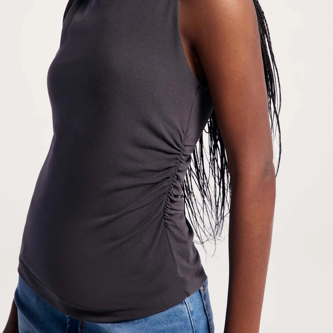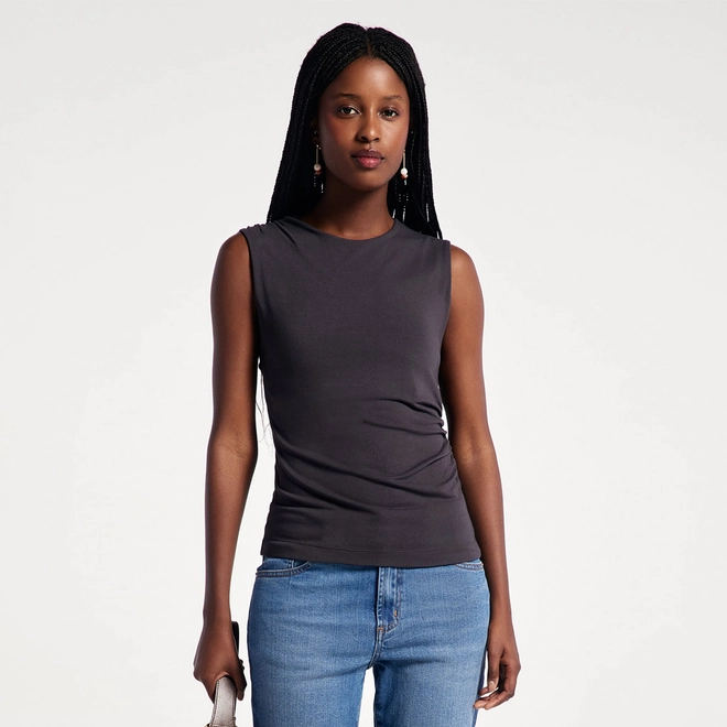 Delicada e moderna na medida certa, esta regata é pura elegância com toque suave. Confeccionada em malha de viscose creponada, ela traz caimento fluido e frescor. A modelagem justa valoriza as curvas com sutileza, enquanto o drapeado no decote e na cintura cria um visual sofisticado e feminino.