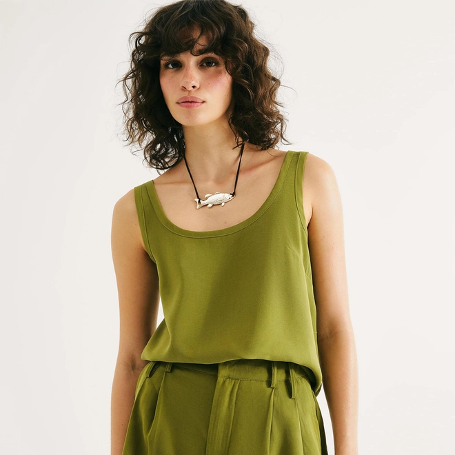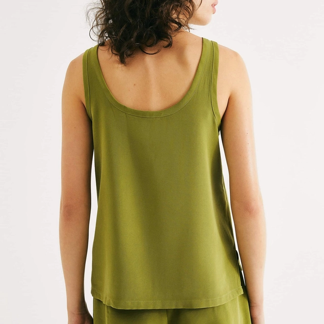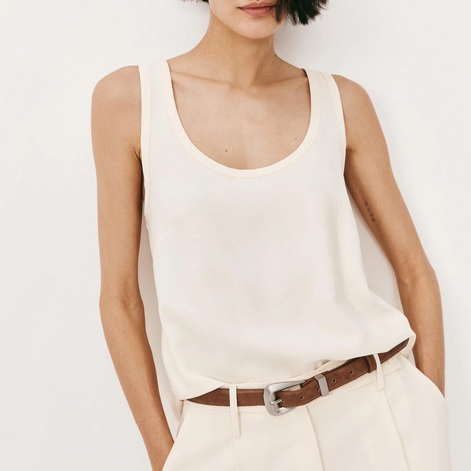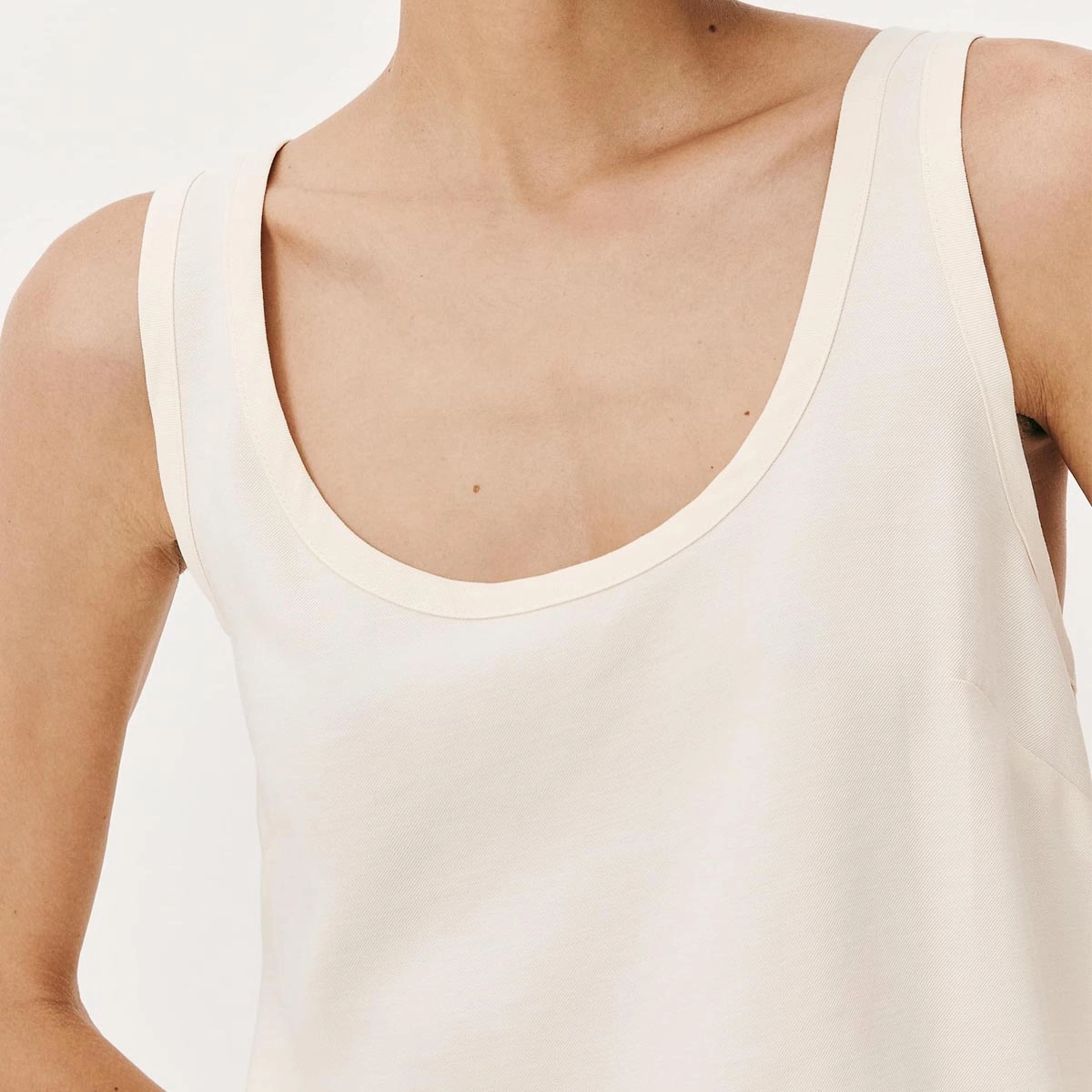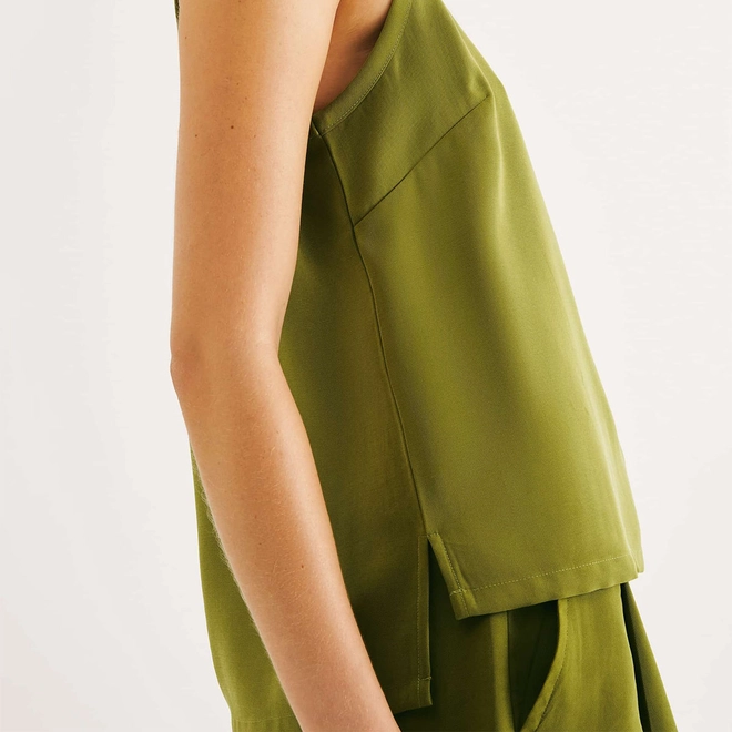 Regata confeccionada em tecido peach touch, que garante um toque macio e confortável ao vestir. Possui decote U, alças médias e um design moderno com a frente levemente mais curta que as costas e fendas laterais, trazendo movimento e charme à peça.