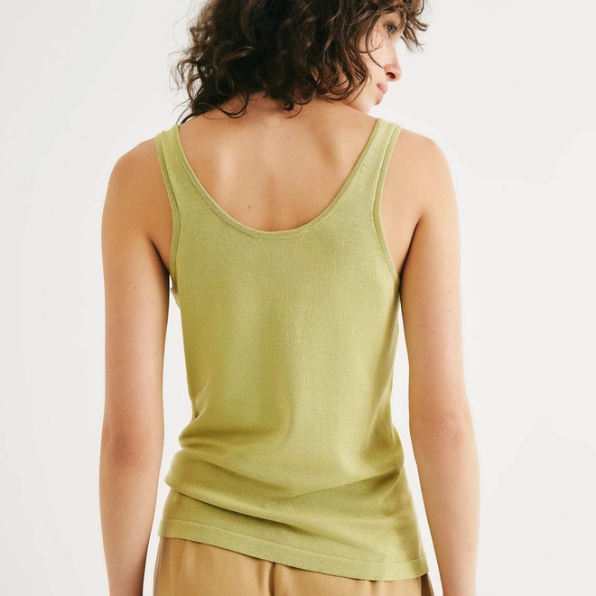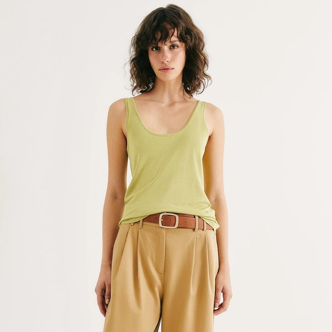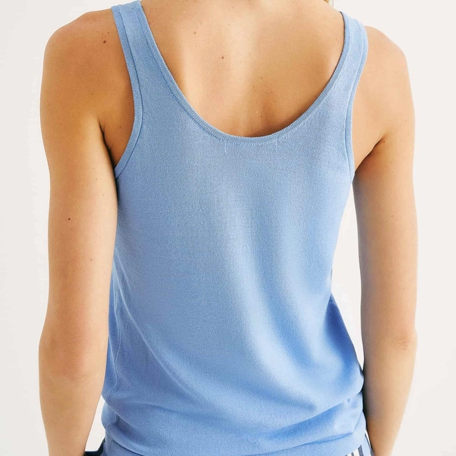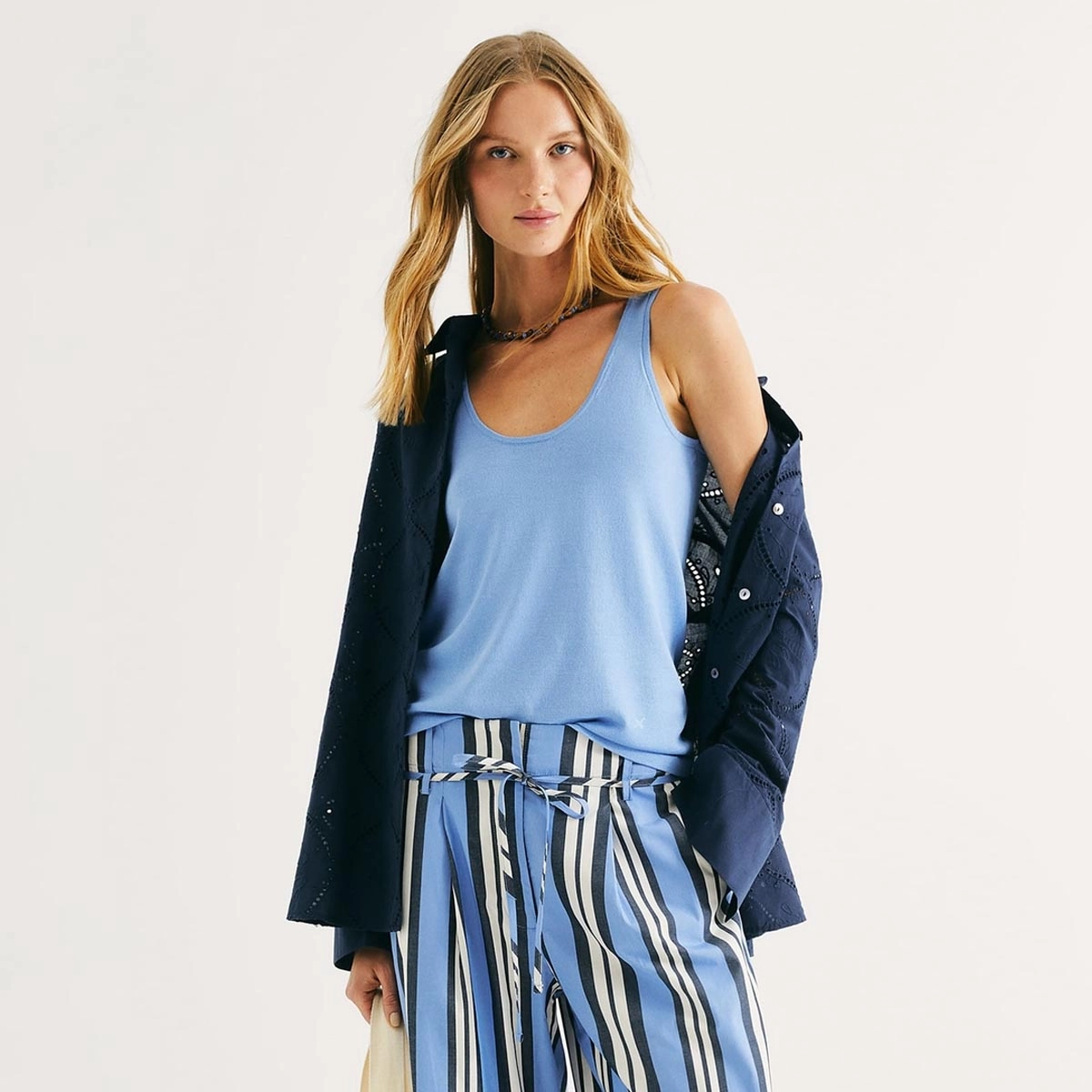 Regata em tricô levinho com ponto delicado, que garante leveza e conforto. Apresenta modelagem regular, solta ao corpo, alças largas e decote U frontal e posterior, ideal para um visual equilibrado. Com comprimento regular, conta com detalhe exclusivo do logo Hering bordado na barra lateral, adicionando um toque de autenticidade à peça. Perfeita para compor looks casuais com estilo e conforto.
