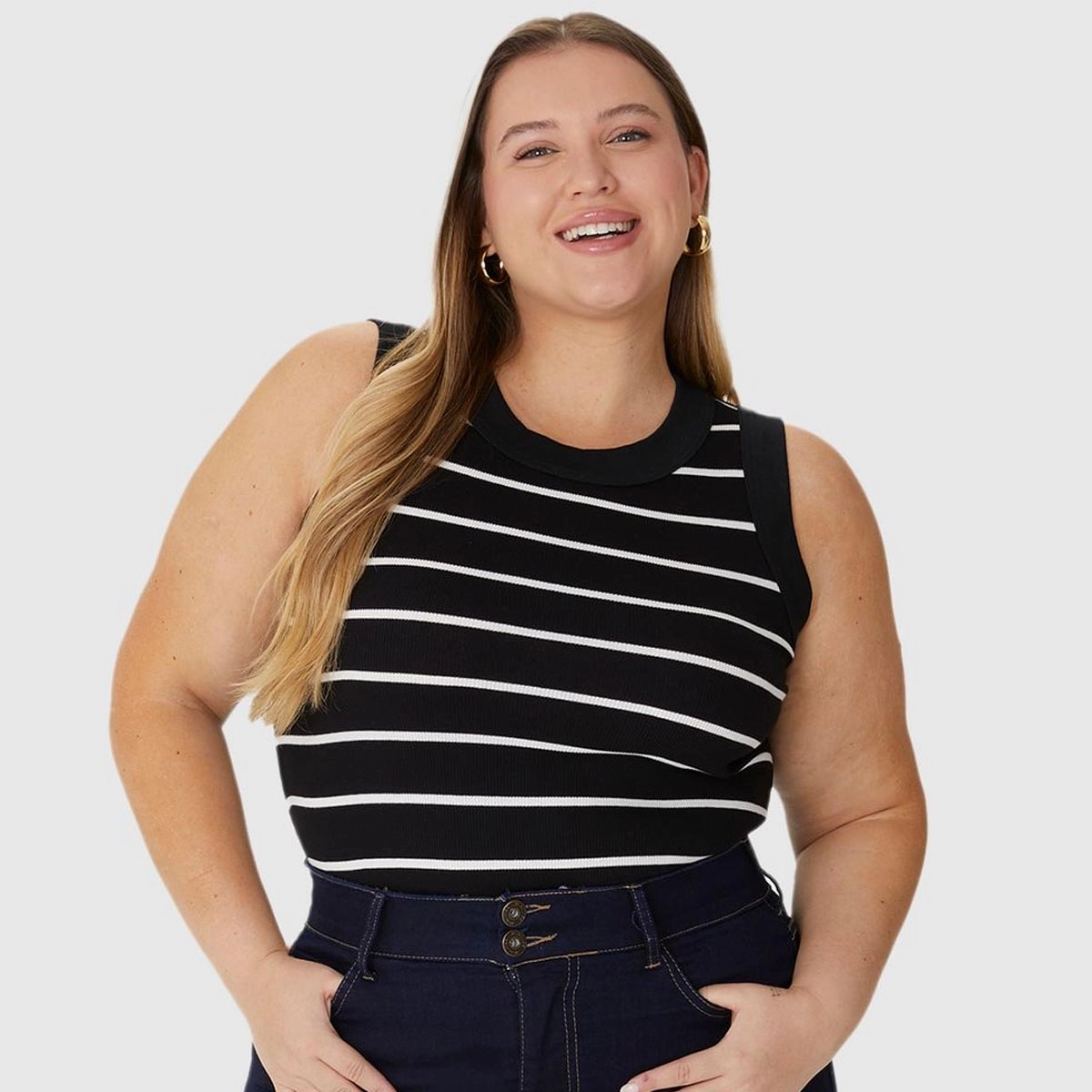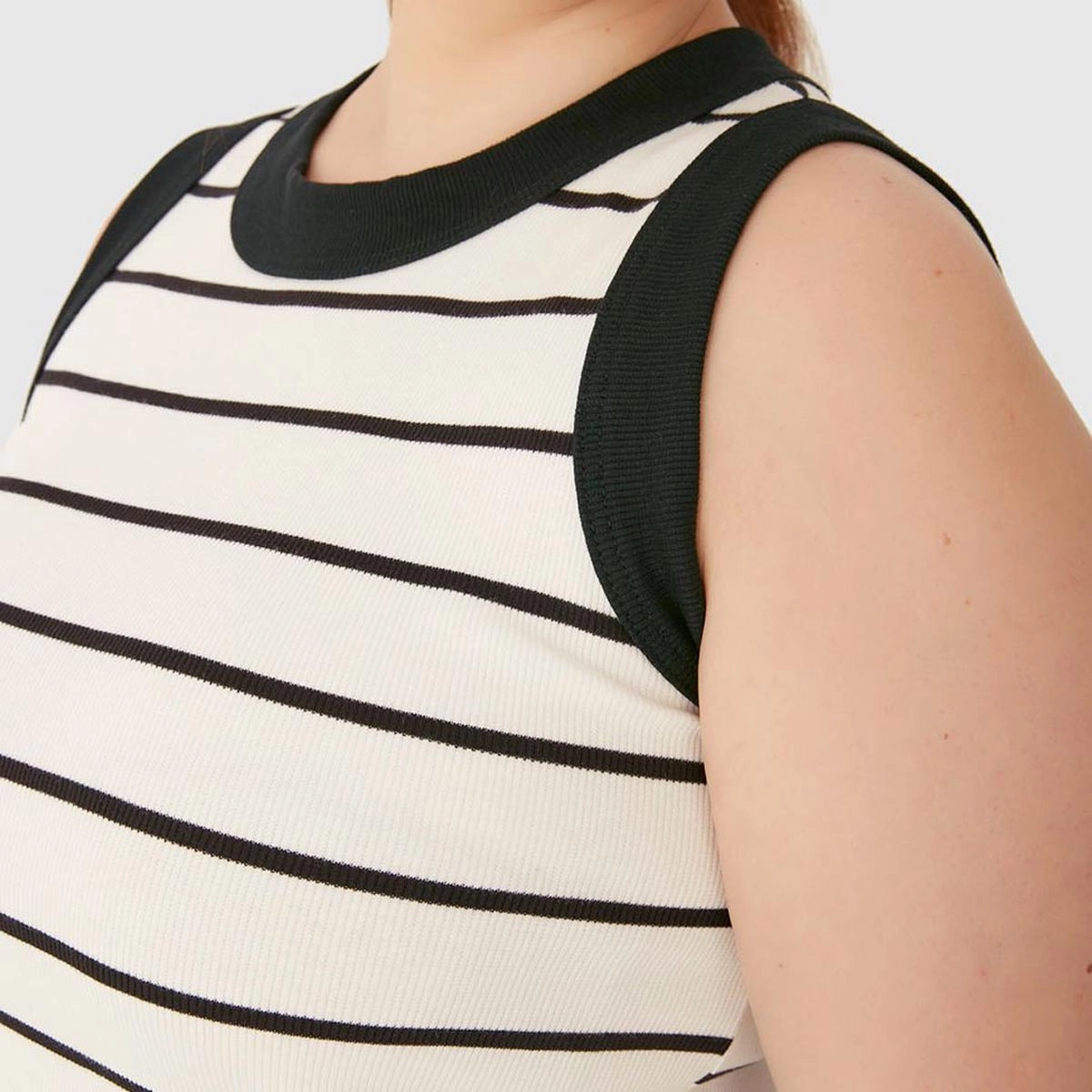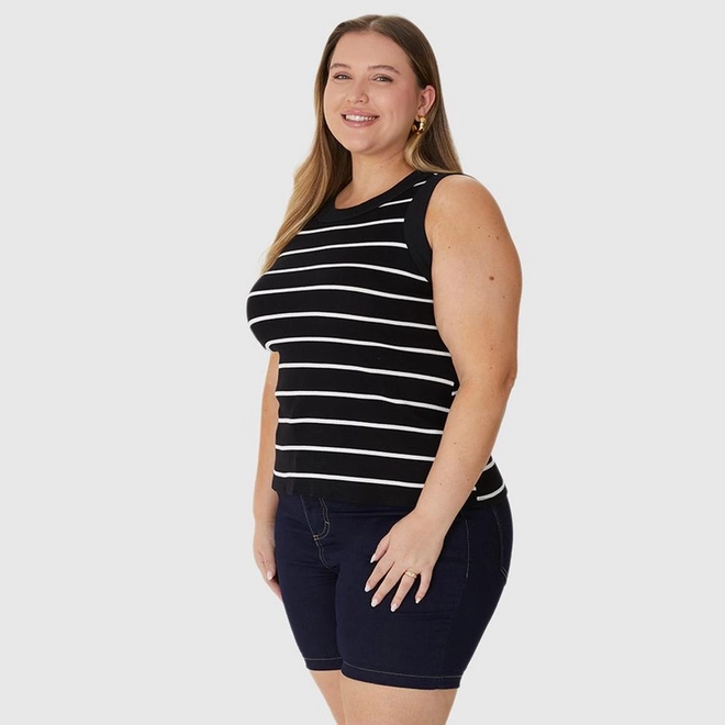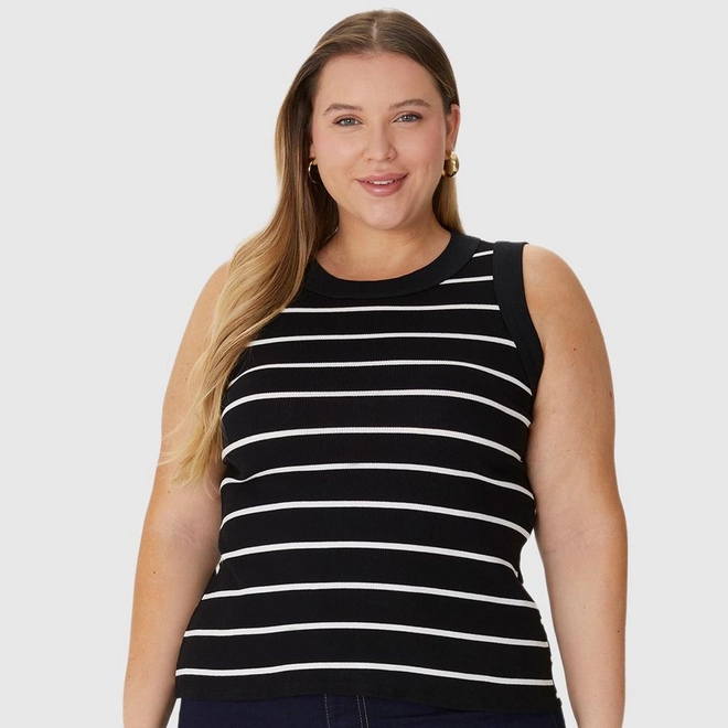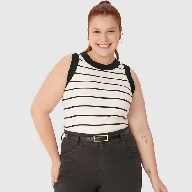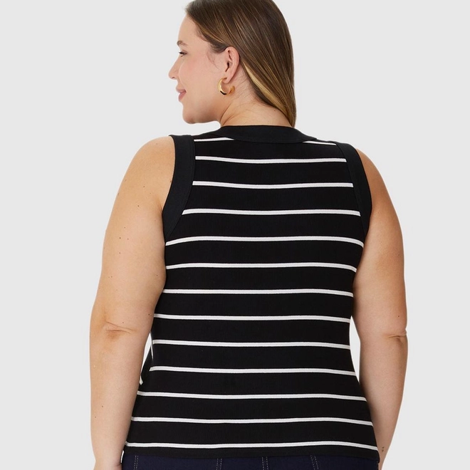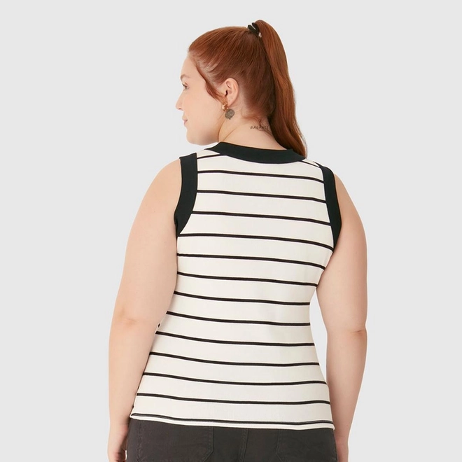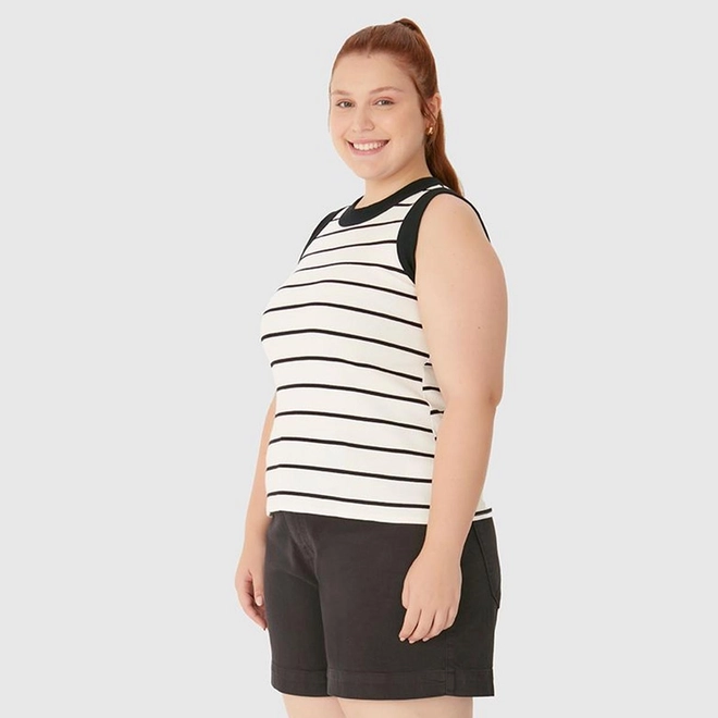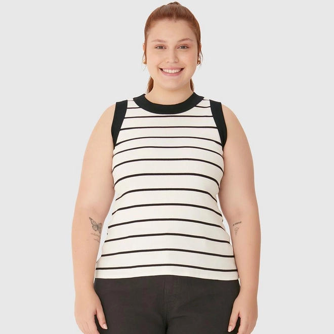 Regata Feminina Plus Size Justa Costura Contraste Em Ribana Listrada