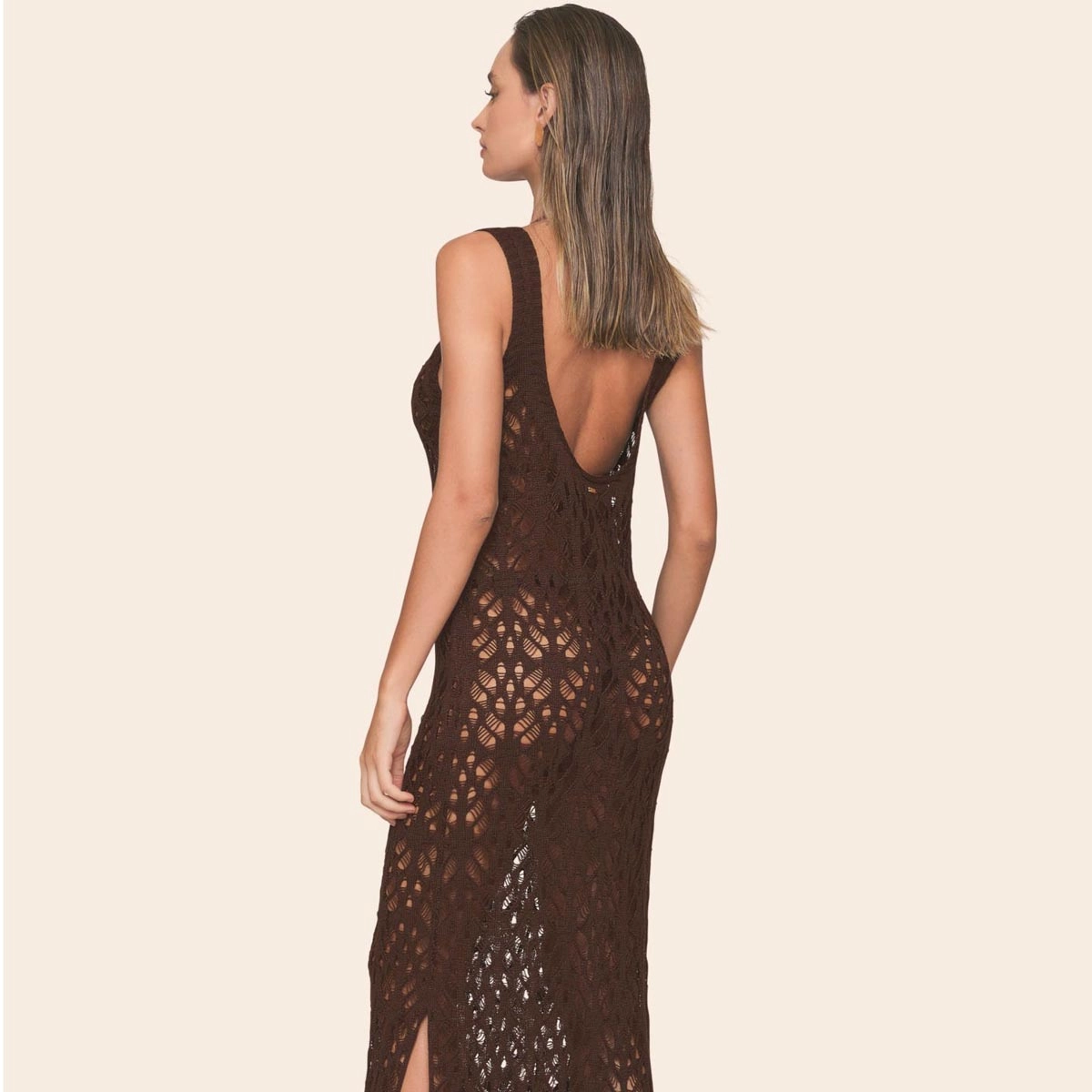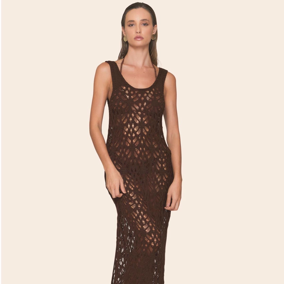 Confeccionada em tela de tricô vazado, esta saída de praia aposta em um caimento fluido e elegante. Sua modelagem estilo regata, com comprimento longo e justa ao corpo, valoriza a silhueta com leveza. Sem forro, é uma escolha moderna e descomplicada para complementar as produções pós-praia com estilo e praticidade.