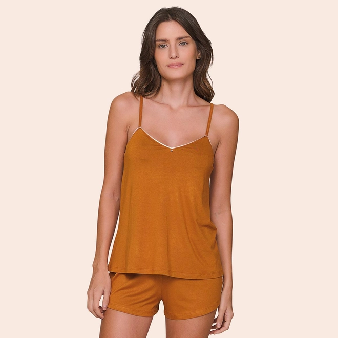 Short Doll Feminino Regata com Alça Regulável, Decote V, Detalhe Acetinado e Shorts Golden Hour