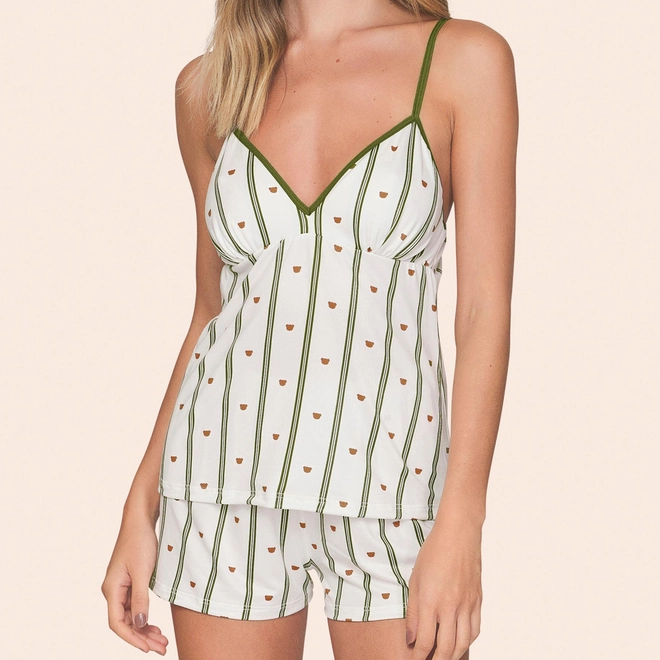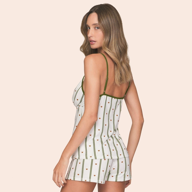 Short Doll com alças finas e toque leve como um carinho: um convite ao descanso com delicadeza e estilo. Confeccionado em malha Sublime Touch – exclusiva Lua Luá – com aquele toque pele de pêssego. A blusa tem alças em elástico macio com reguladores, proporcionando ajuste perfeito ao corpo, e busto duplo para maior conforto e segurança. O shorts vem com acabamento em elástico suave, ideal para noites relaxantes ou manhãs preguiçosas. Com estampa que une listras verdes e pequenos ursinhos por toda a peça, além de filetes contrastantes. Uma fofura!