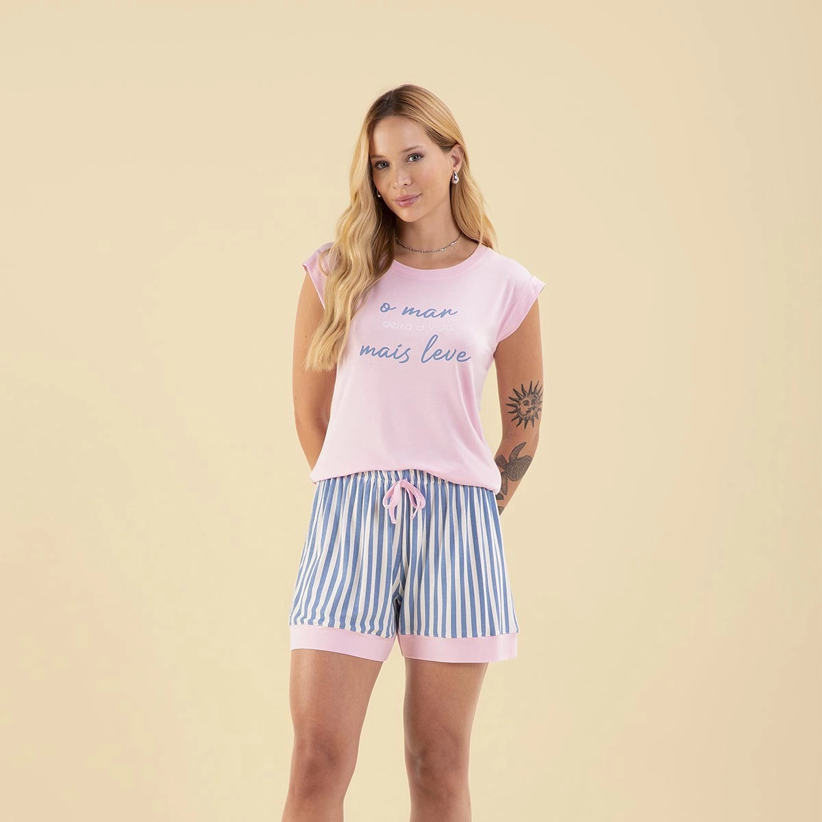 Com design delicado e estampa inspirada no clima praiano, o conjunto traz uma blusa leve e um short confortável, garantindo liberdade de movimentos e um visual descontraído e charmoso.