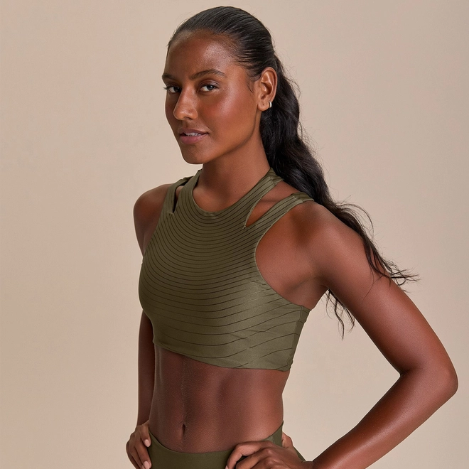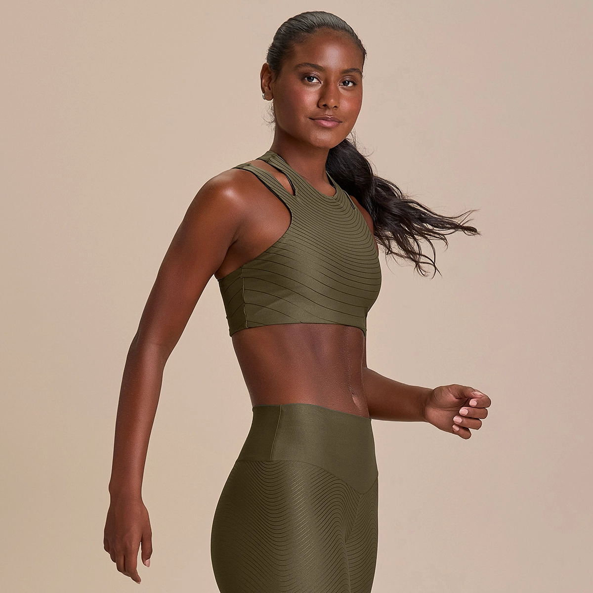 Ideal para práticas de intensidade moderada, o Top Allure® Mat une sofisticação e conforto com recorte nos ombros e bojo removível, acessível por uma pequena abertura interna. A estampa localizada com linhas orgânicas imprime dinamismo ao visual. Confeccionado em Allure® Mat com tecnologia inclusiva LYCRA® ADAPTIV, adapta-se ao corpo com máximo conforto. O aspecto canelado opaco adiciona sofisticação, e a proteção UV 50+ torna a peça ideal para atividades ao ar livre.